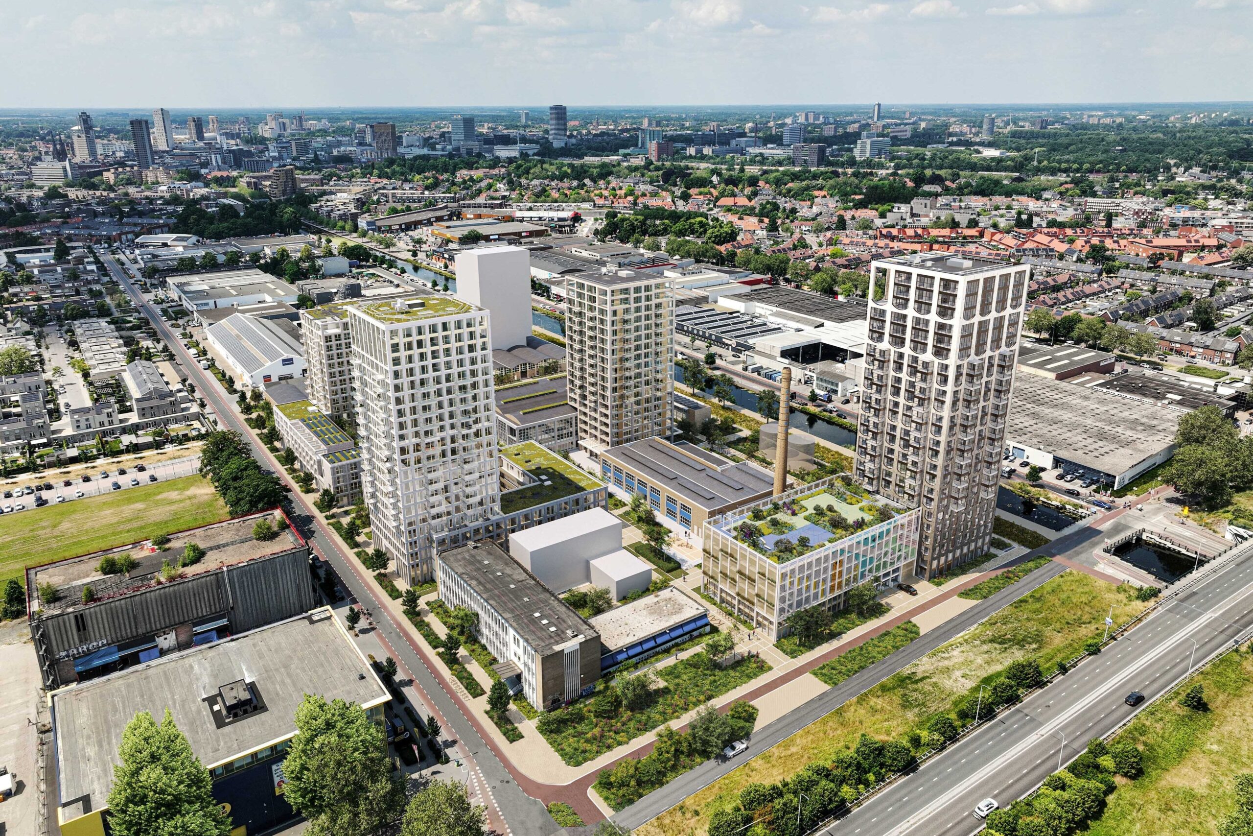 The monumental buildings on the site will be preserved, transformed and extended with five residential towers, two residential blocks around inner gardens, a greenhouse building and an intensively greened, car-free inner area, according to a master plan by Studioninedots and DELVA Landscape Architecture & Urbanism. The reconstruction architecture of the factory buildings is the starting point for the new buildings, each of which will forge the area into a coherent whole, interpreted differently.