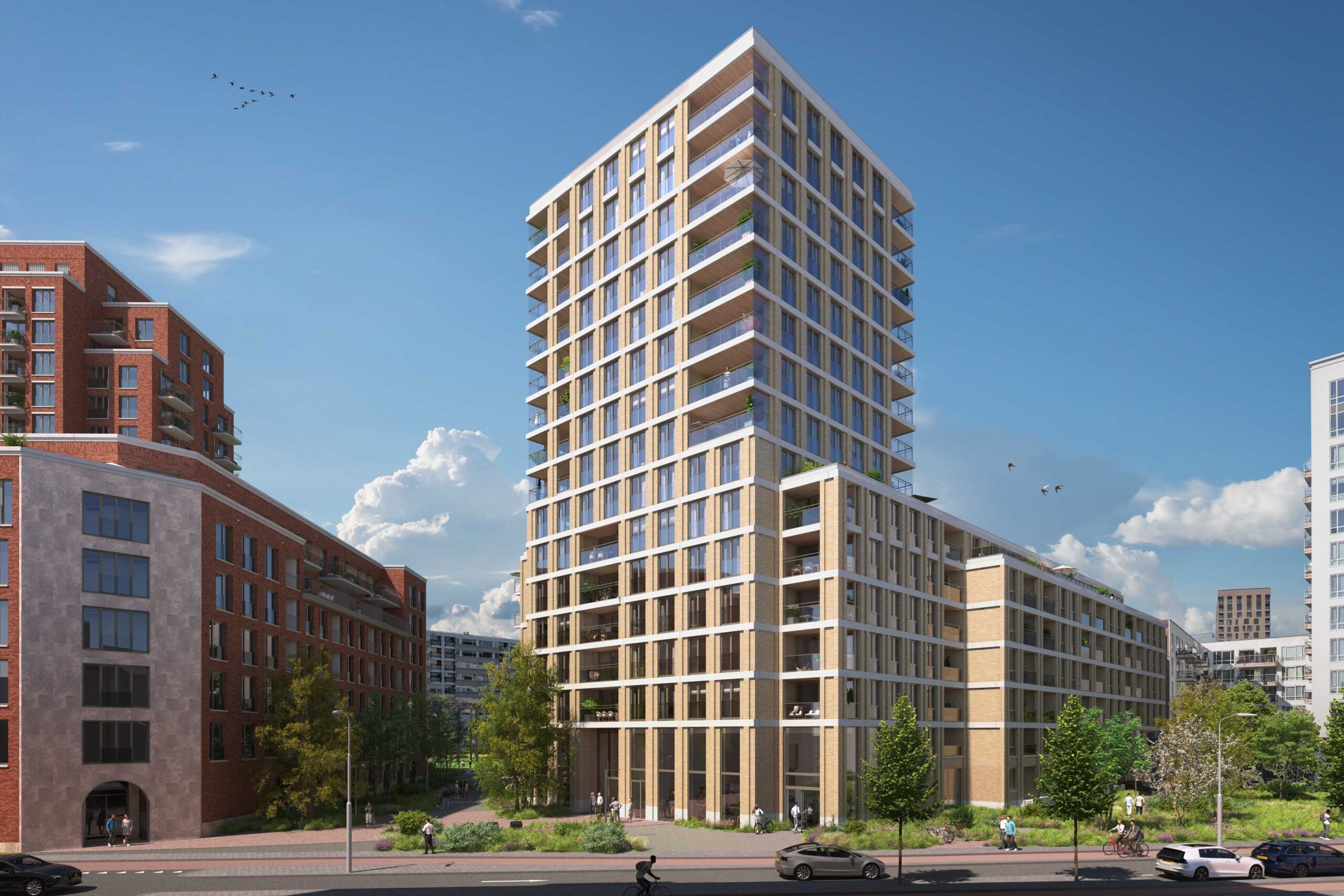 The façade design of the north block of Kingswei is characterised by a harmonious combination of horizontal and vertical articulations. White bands in the façade emphasise the length of the building, while robust masonry dams provide vertical accents. Storey-high window frames and open corners in the tower create a light and transparent whole. The low-rise encloses the intimate, green courtyard garden with two arms. Rendered in pale yellow brick and white concrete bands, the building looks fresh and optimistic.