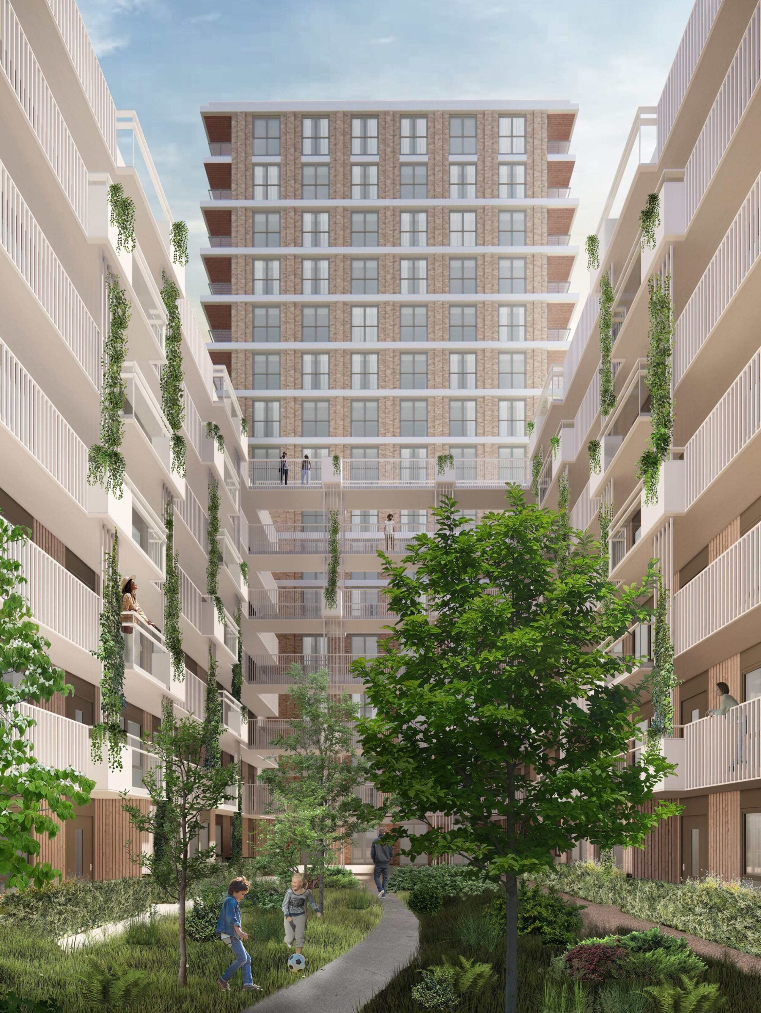 The north block designed by LEVS follows the existing line and height profile of the adjacent Katterug by Van den Broek and Bakema from 1975. Together with the adjacent existing buildings and the southern block, three height accents are created on Koningswei. Both north and south blocks embrace a courtyard garden for residents with a low-rise section. While densifying here, we also reinforce the reduction in scale towards the low-rise buildings south of the site.