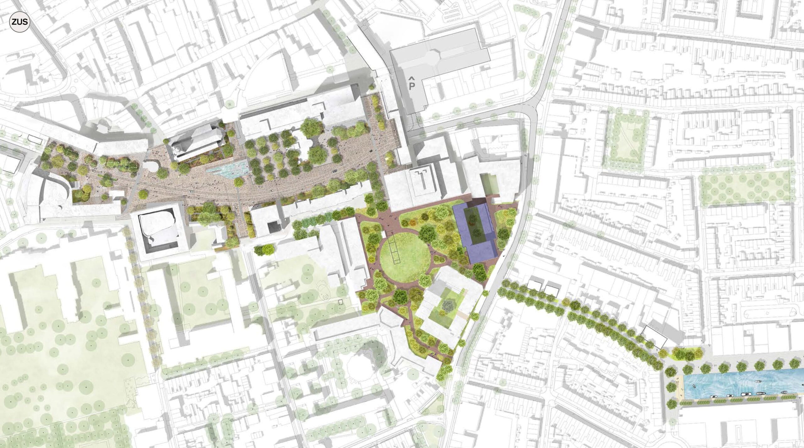ZUS' design for the public space transforms the petrified square into a playground, a new city park with lots of greenery and 150 new trees on top of the old parking deck. The Koningswei encloses the new building blocks. These are not on but as much as possible on the Koningswei. The landscape literally folds around the corner of south block and north block. One element of the current Koningsplein will be retained: the steel pergola designed by architect Jo Coenen will be given a second life in a modified form. It will be refurbished and transformed into an overgrown and flowering pergola and play structure.