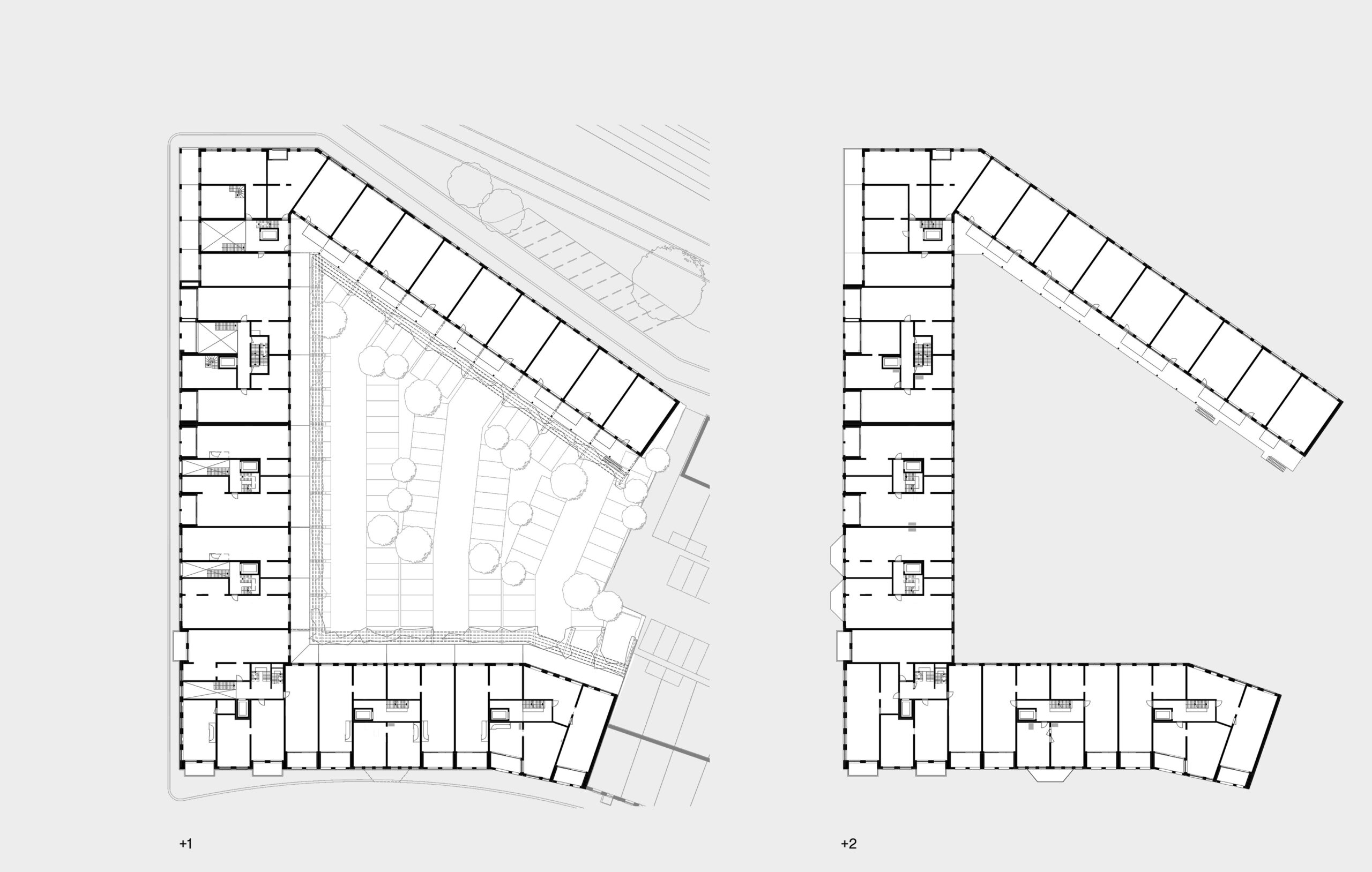 Architecturally, the complex is constructed as legible buildings that clearly differ in color, rhythm and outdoor space. They are executed in carefully detailed masonry with a rich mix of color and texture and various masonry bandages and relief. This is supported by deep nicks and careful masonry detailing.