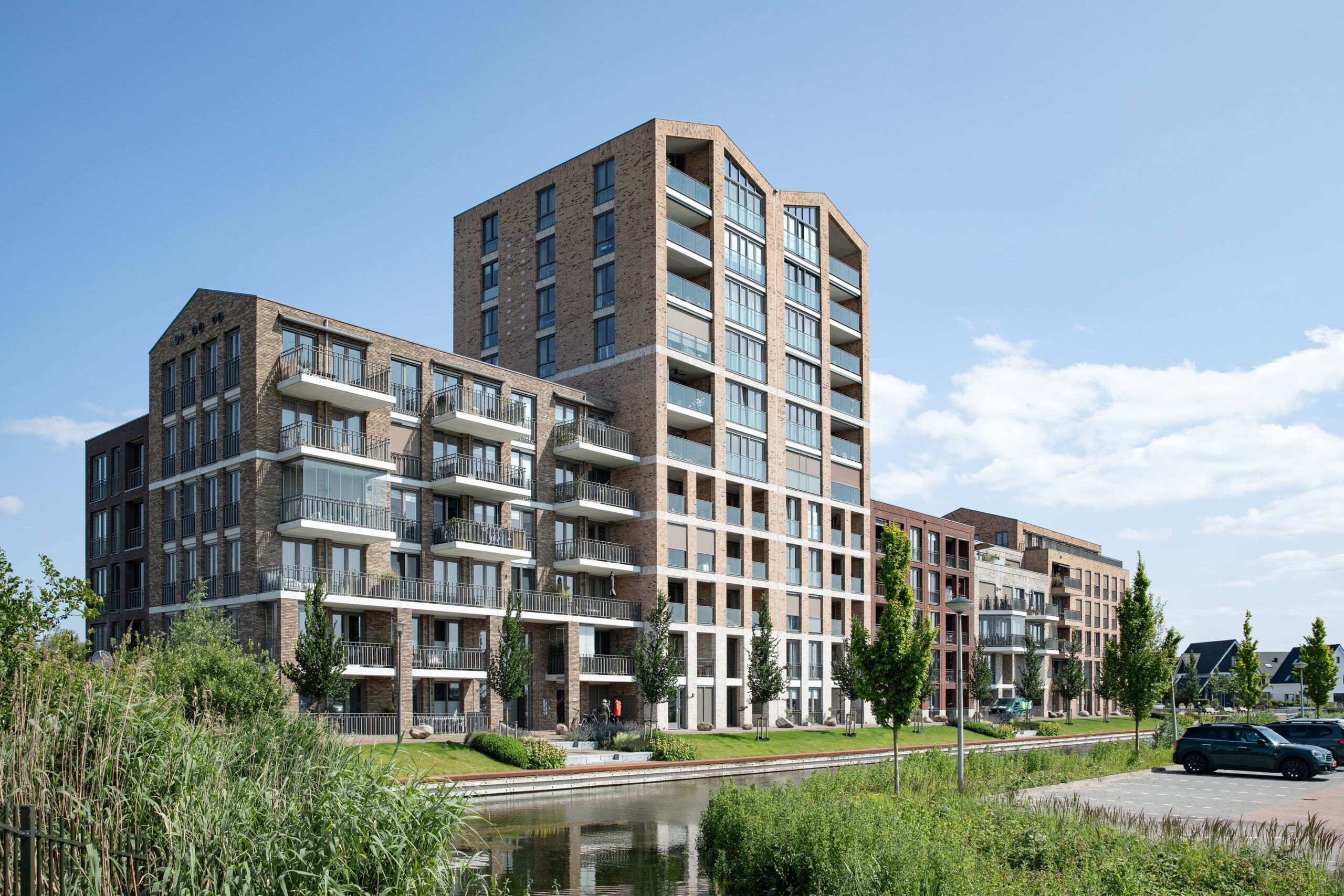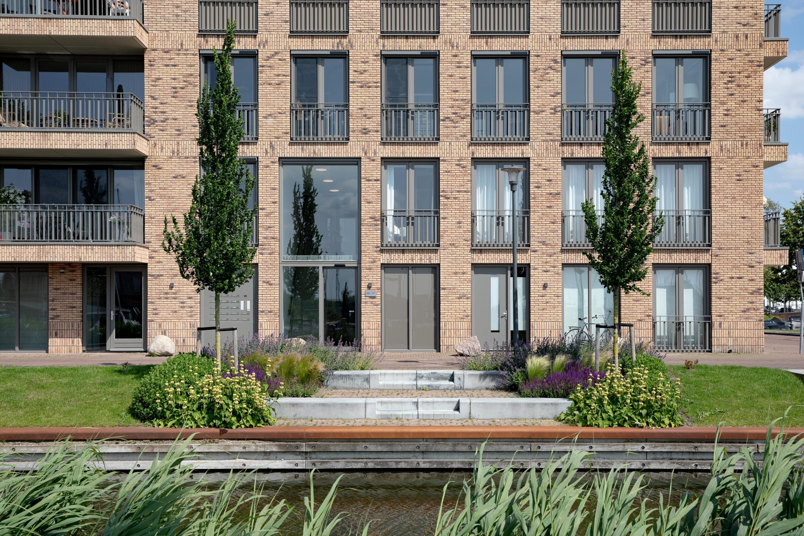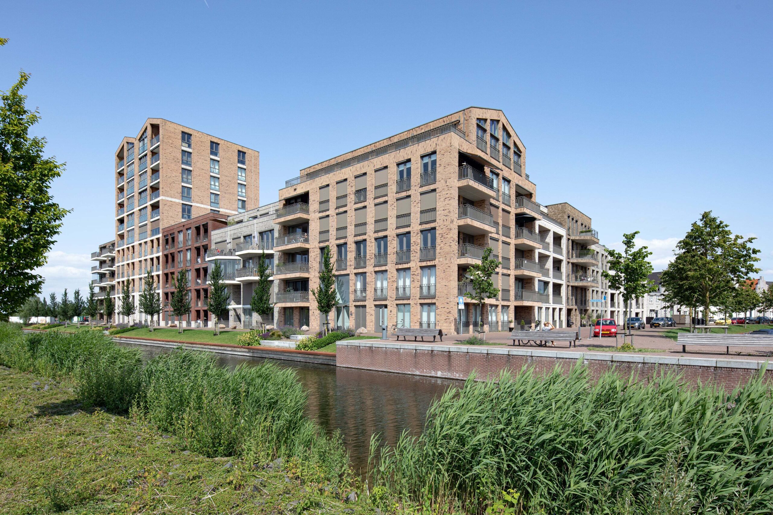 Harderwijk’s new waterfont consists of twelve buildings, seven of which are along the water. These buildings have their own internal access, and each has its own entrance from the street. They vary in height and thus connect to the low houses along the Singel. This transition from ground-level homes to the port front is gradually being increased in scale, size and color. This creates a natural structure towards the prominent head on the boulevard. The grain grows from single family houses to larger buildings with the eleven-storey double house as the real Kop van de Bakens.