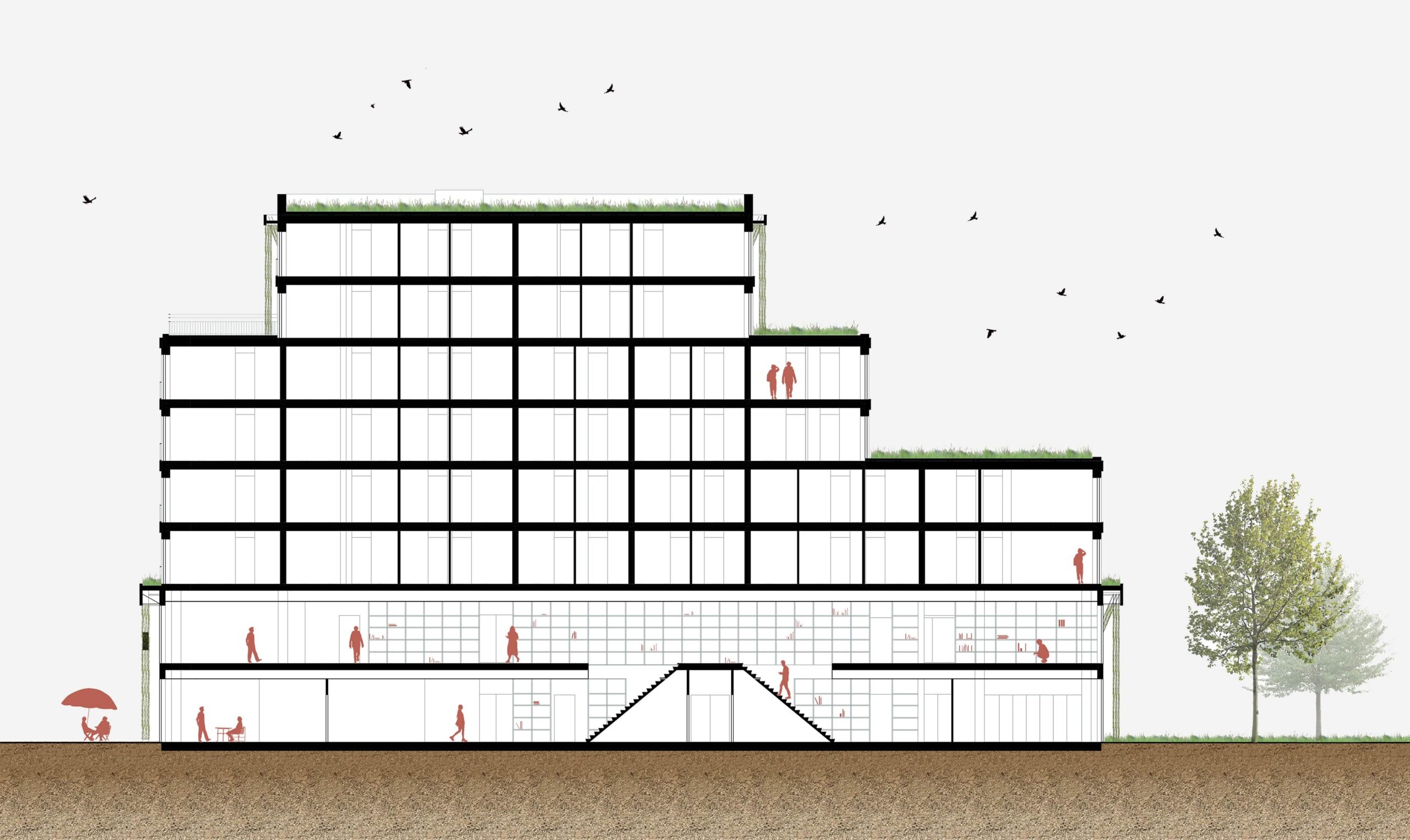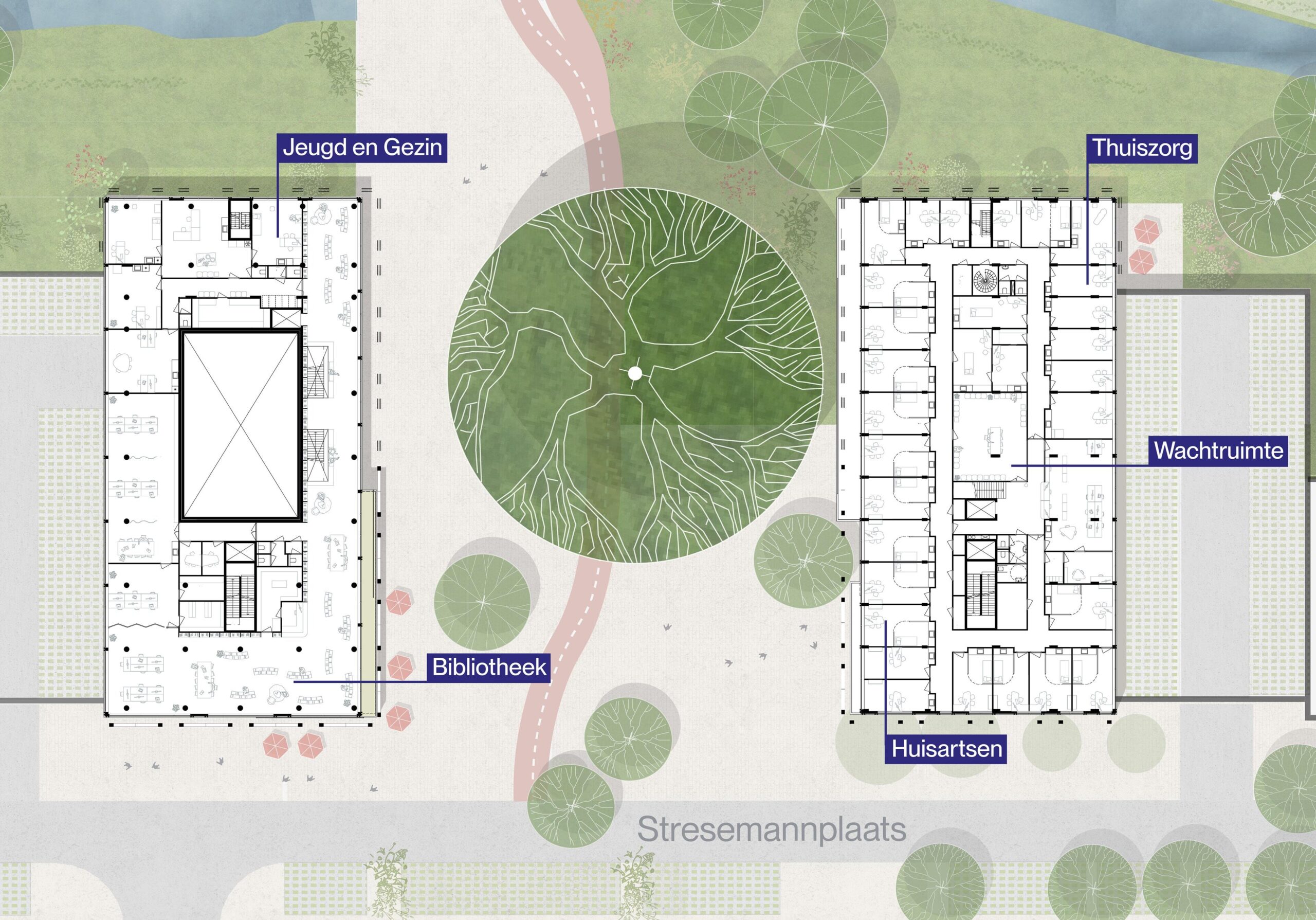 Populus gives a social impulse to the area. With a new central square, where different movements through the neighbourhood come together. And with Third Places, places where people spend their time apart from home and work. In Populus, we bring together several such places, from a physiotherapy practice, a library, a place for performances to a neighbourhood café. With great attention to sightlines, light, openness and intimacy, we connect them into continuous zones around the square where residents and visitors feel safe and want to meet each other.