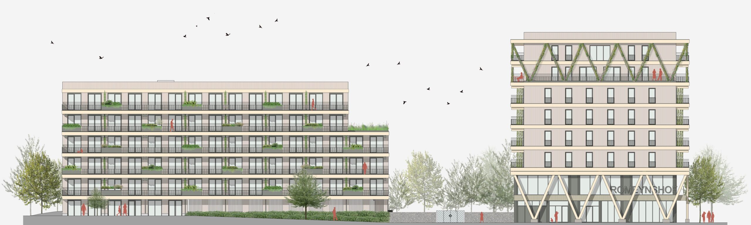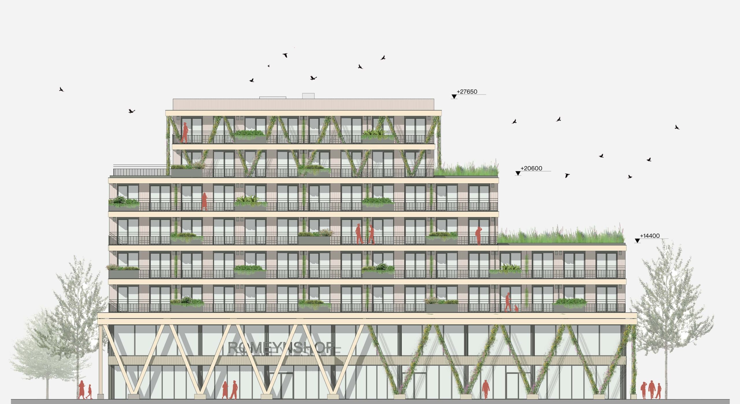 Populus is a light, human and contemporary response to the Ommoord neighbourhood, which is characterised by austere and purposeful reconstruction architecture, with horizontal bands as its main characteristic. Populus is not a counter-reaction but a reinforcement, both in the urban design and in the interplay of lines in the façade. Light colours, natural materials and vegetation ensure that the buildings exude optimism. In addition, all-sidedness, horizontal articulation and a social plinth behind the V columns ensure human scale and recognisability. The buildings fit the place, but clearly announce a new era.