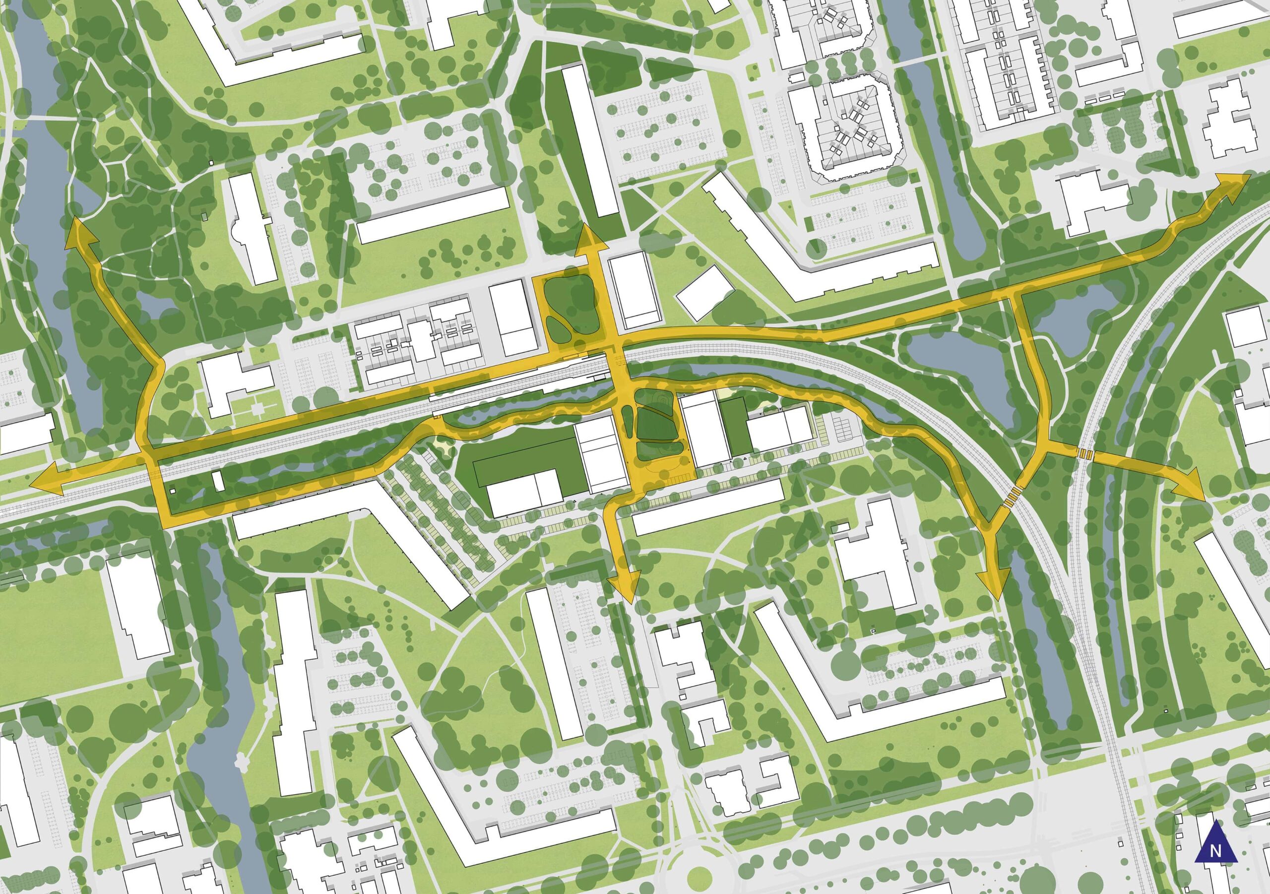 The landscape design reconnects Ommoord's main park structure. The ecological, water-rich zone is extended into the heart of Populus. Following the ideas of Louis Le Roy, with Populus we create space for real nature, which can grow wild. The terraces oriented towards the ecological zone draw the greenery out of the park. This gives the area a more complex three-dimensional quality, simultaneously providing a human scale, a nature-inclusive living experience and a green urban living environment. The extended water structure, landscape and terraces are intensively used for rainwater harvesting, biodiversity enhancement and cooling.