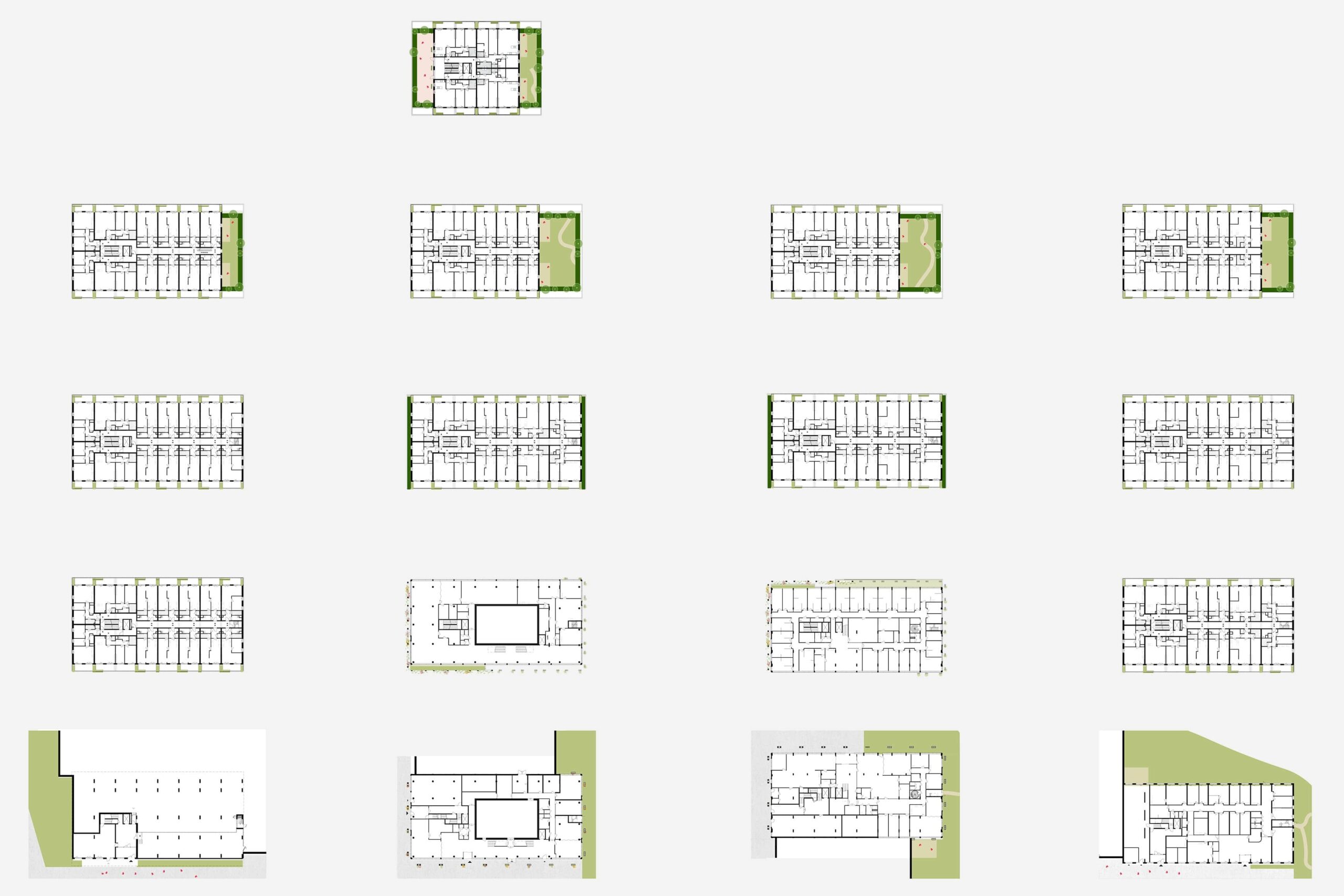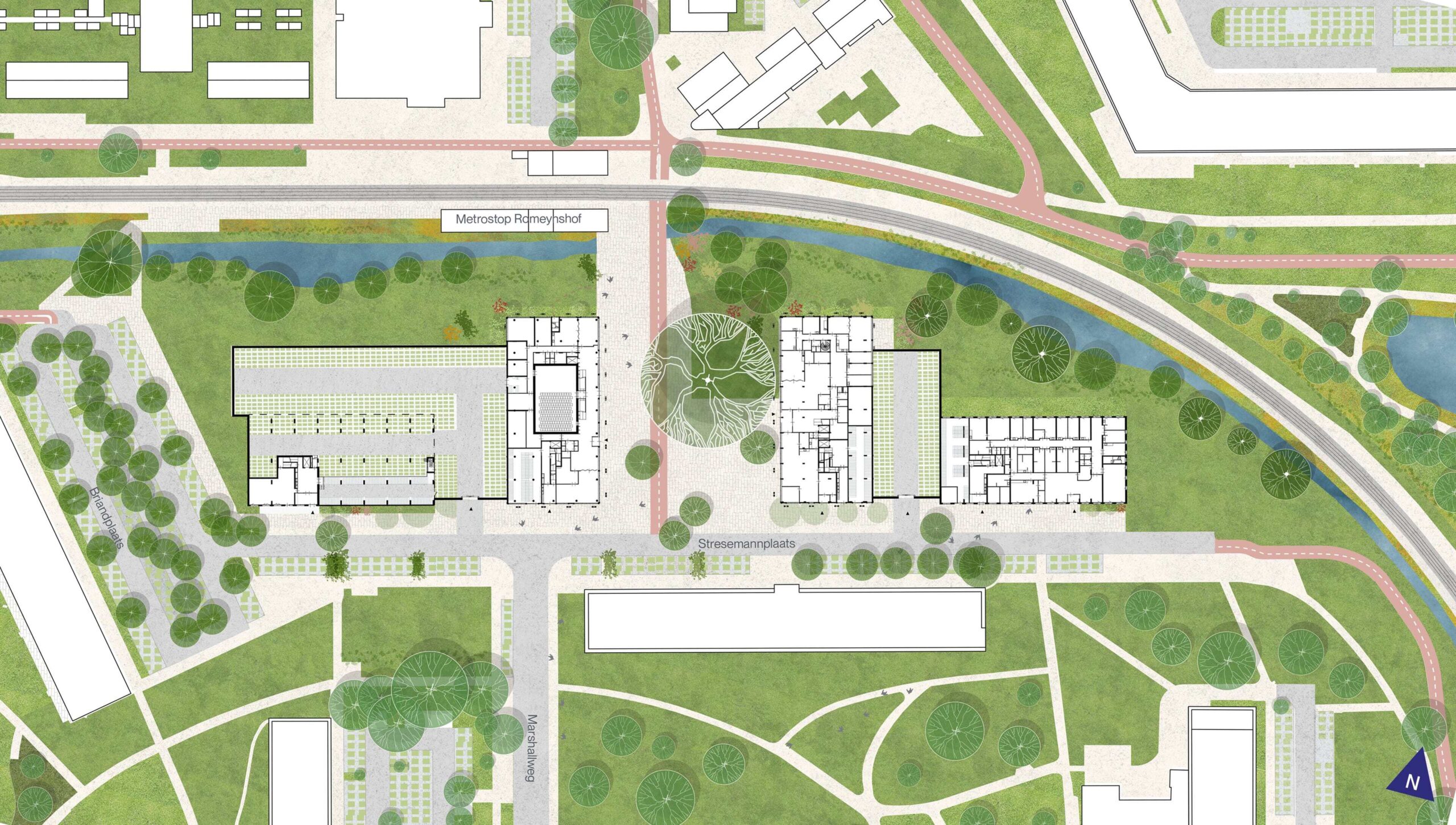 The name Populus refers to the existing large poplar tree on the new central square and to the new residents, visitors and passers-by of Romeynshof. Located next to a metro station, Romeynshof is a focal point for public transport, living, working and recreation. Embedded in an ecological park and stone’s throw away from landscape-park De Rotte. The four blocks are placed logically in relation to the routes and surrounding buildings. This results in a central axis with a square and a park where public liveliness is concentrated, and a peripheral zone of housing adjacent to the park.