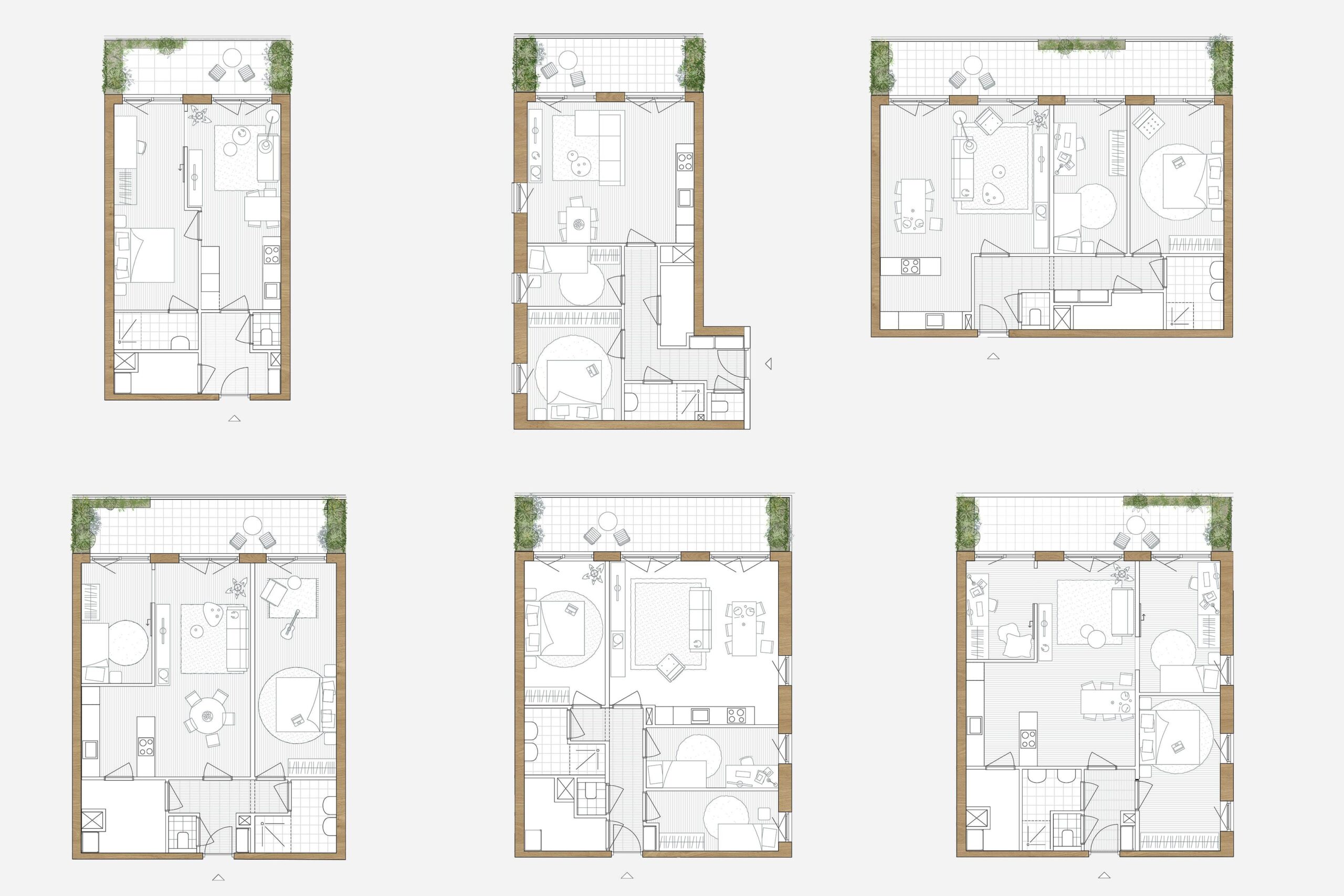 Flexibility, community and nature. That characterises living in Populus. By building with a columnar structure, we ensure great freedom in dividing, combining and adapting the homes, both now and in the future. Residents have access to various types of shared spaces, such as a collective roof terrace and the living room in block B. The all-sided blocks let in a lot of light, especially in the panoramic corner houses. The exposed wooden columns add atmosphere and, together with the plants on the outdoor spaces, they bring nature into the home everywhere. From the balconies, residents look out over green roofs, vegetated terraces and a living landscape.