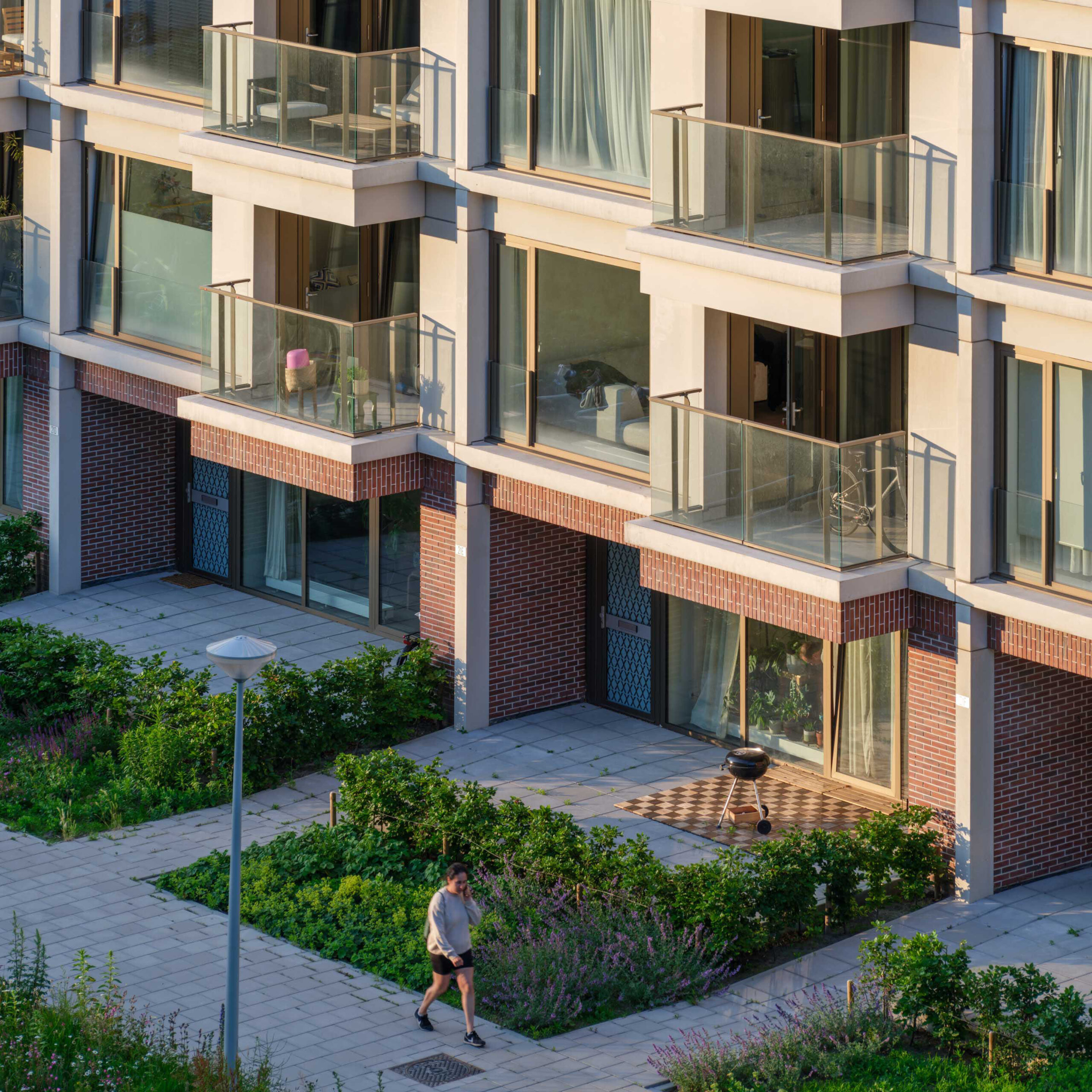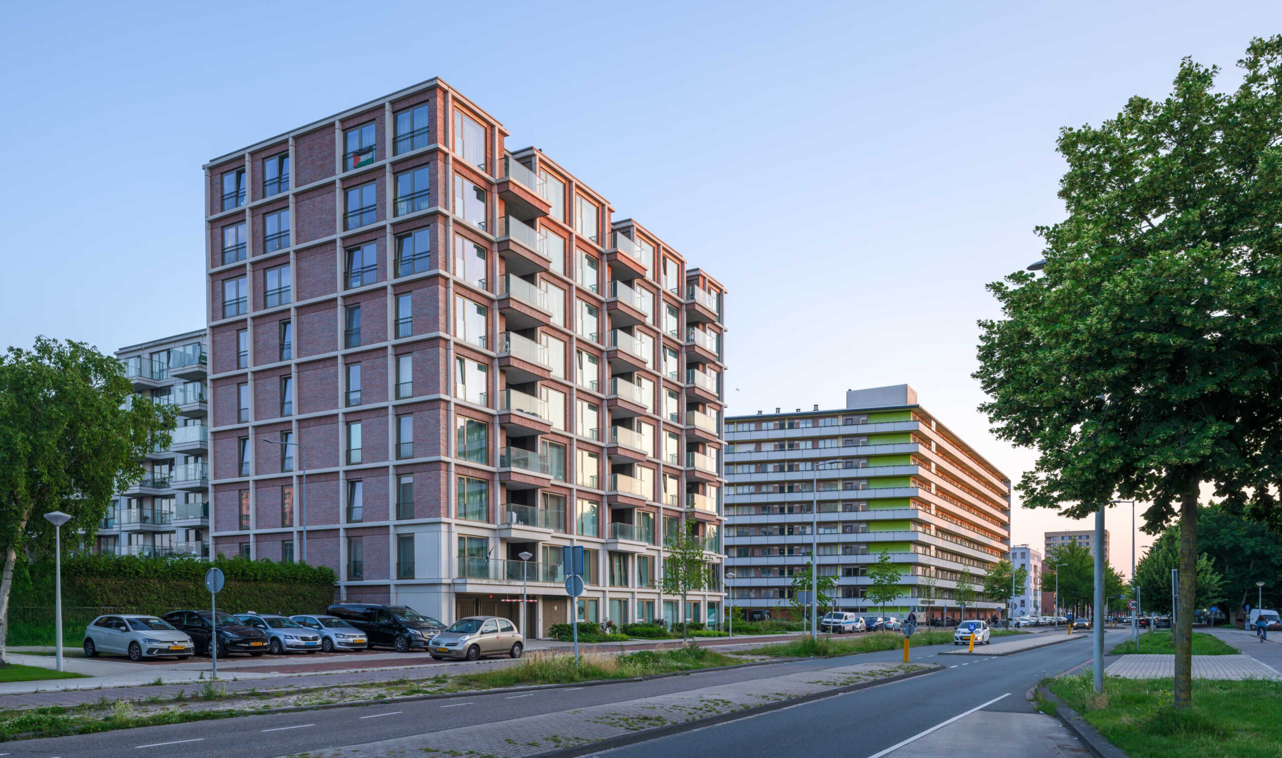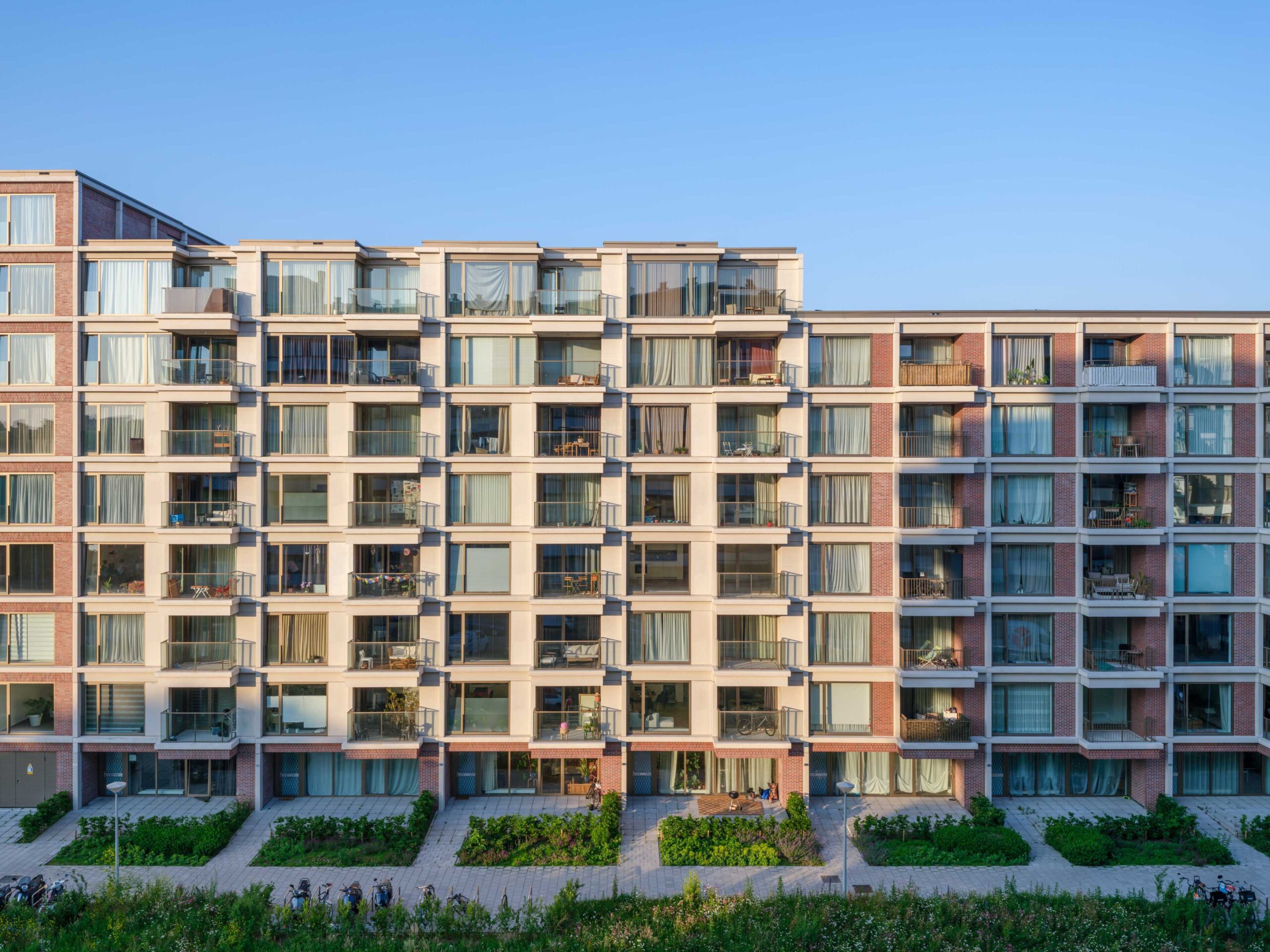 The façade is composed of a horizontal and vertical grid, filled with balconies that add rhythm and refinement. The stepped volume from nine to six stories guides the transition from metropolitan scale to greenery. The housing programme is diverse, ranging from three-room apartments and maisonettes to friends-apartments. Daylight in the corridors, wide apartment layouts and semi-sheltered balconies ensure high living quality, while the plinth, with its tall entries and cozy, open front gardens, enlivens the streetscape.