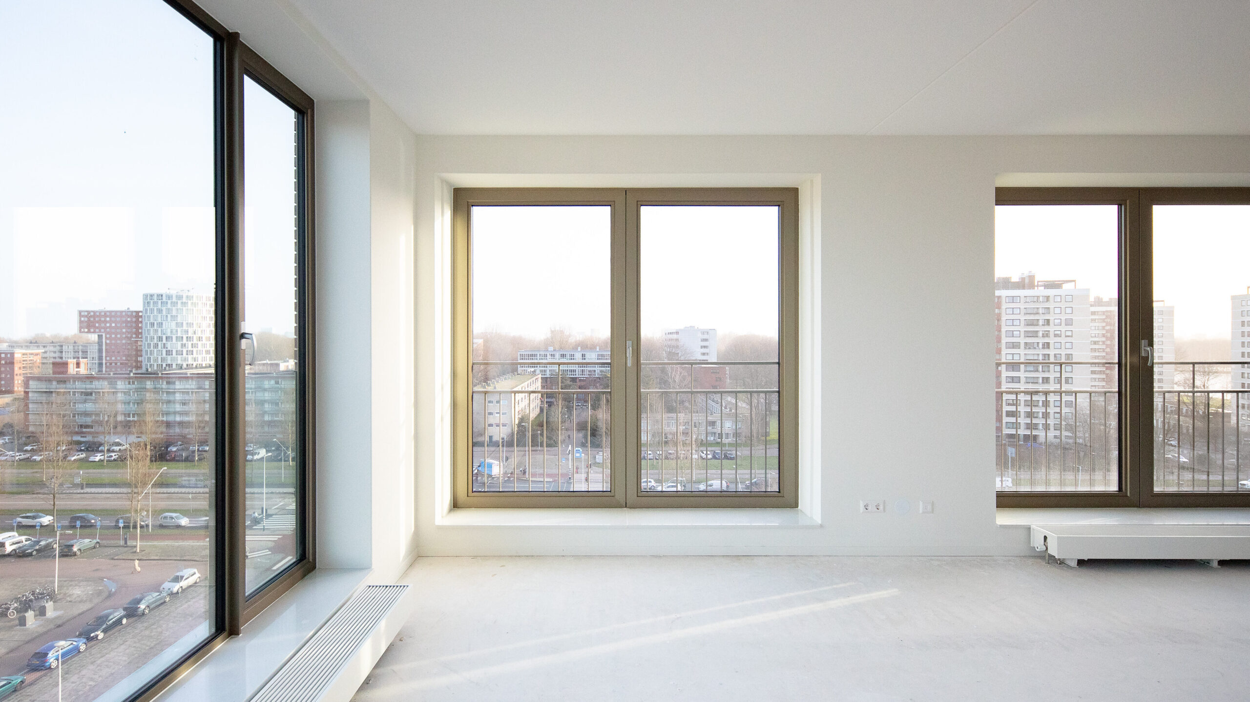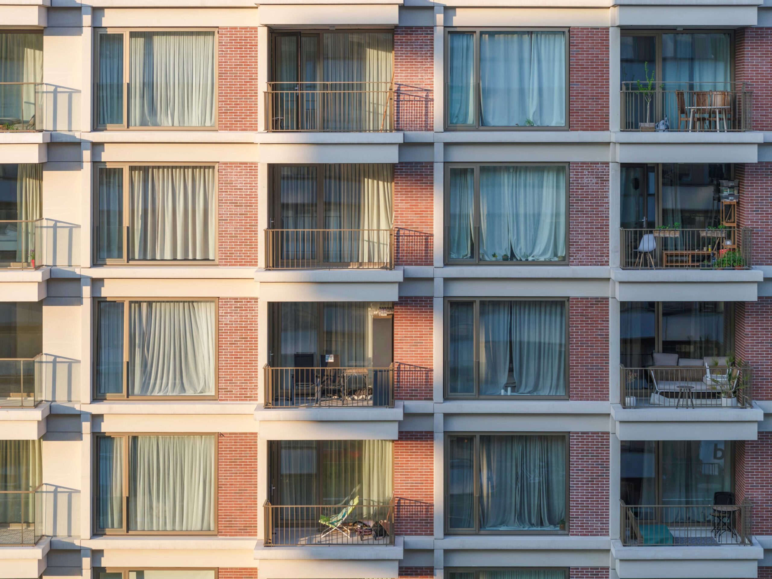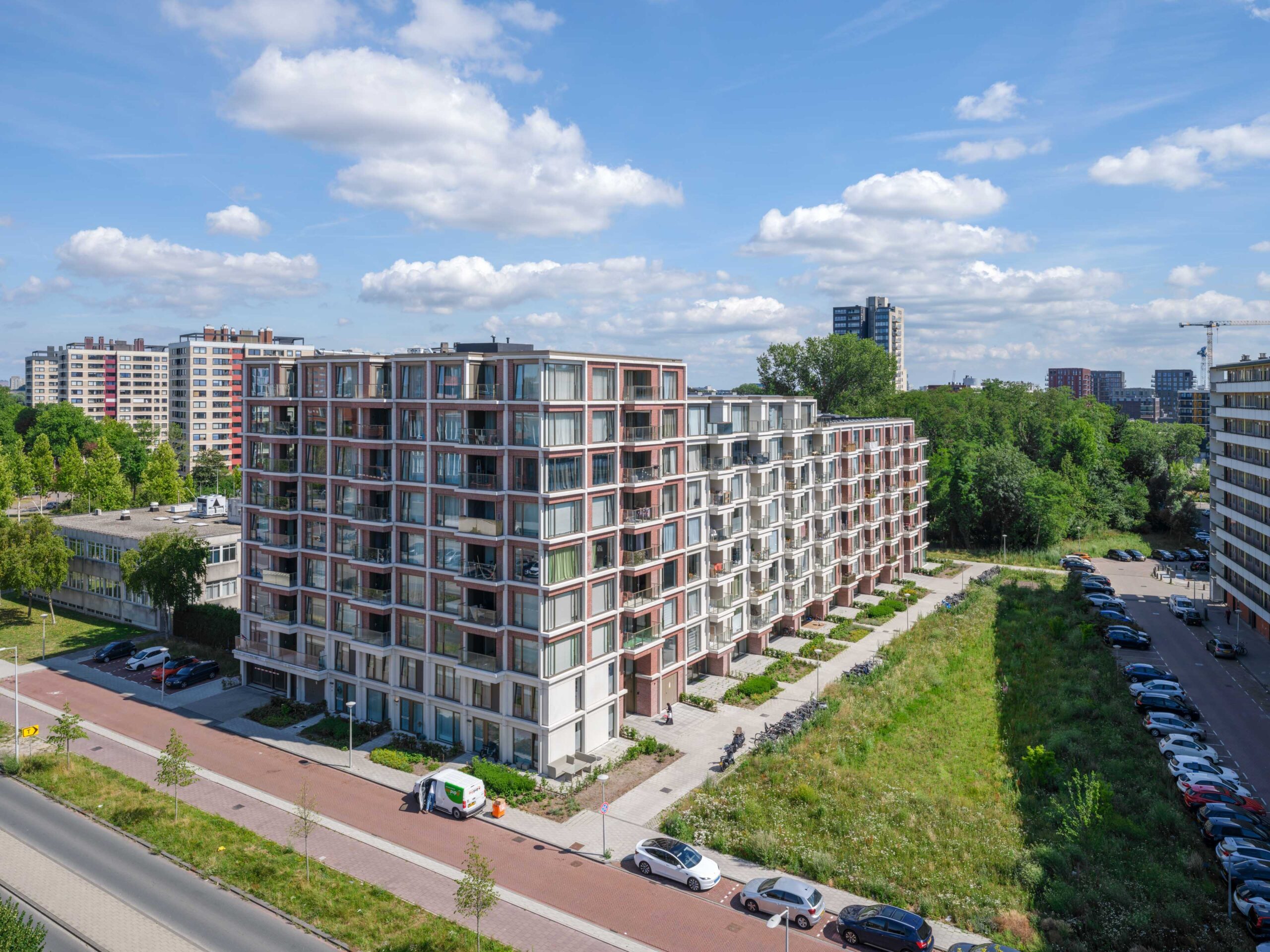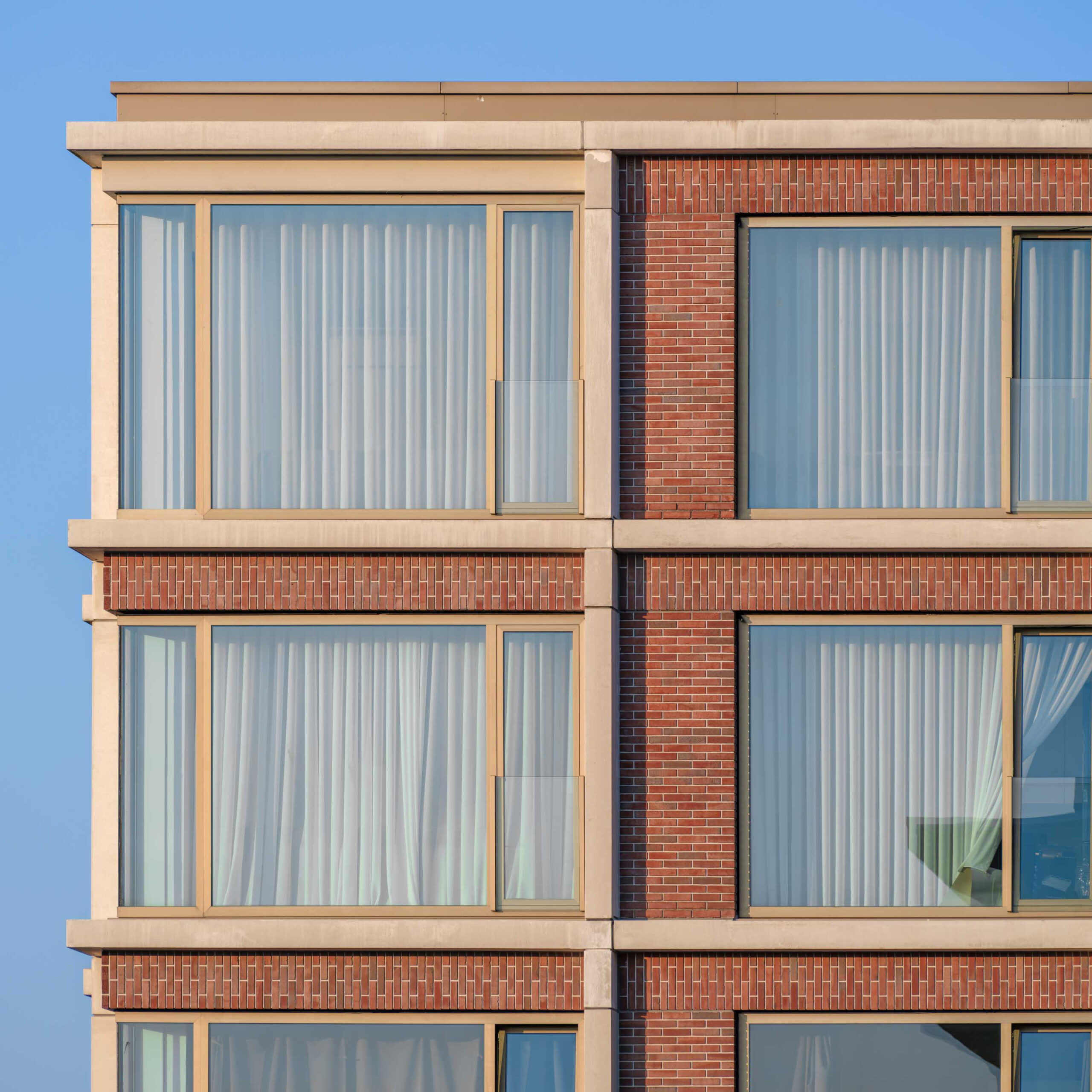 The façade is composed of a horizontal and vertical grid, filled with balconies that add rhythm and refinement. The stepped volume from nine to six stories guides the transition from metropolitan scale to greenery. The housing programme is diverse, ranging from three-room apartments and maisonettes to friends-apartments. Daylight in the corridors, wide apartment layouts and semi-sheltered balconies ensure high living quality, while the plinth, with its tall entries and cozy, open front gardens, enlivens the streetscape.