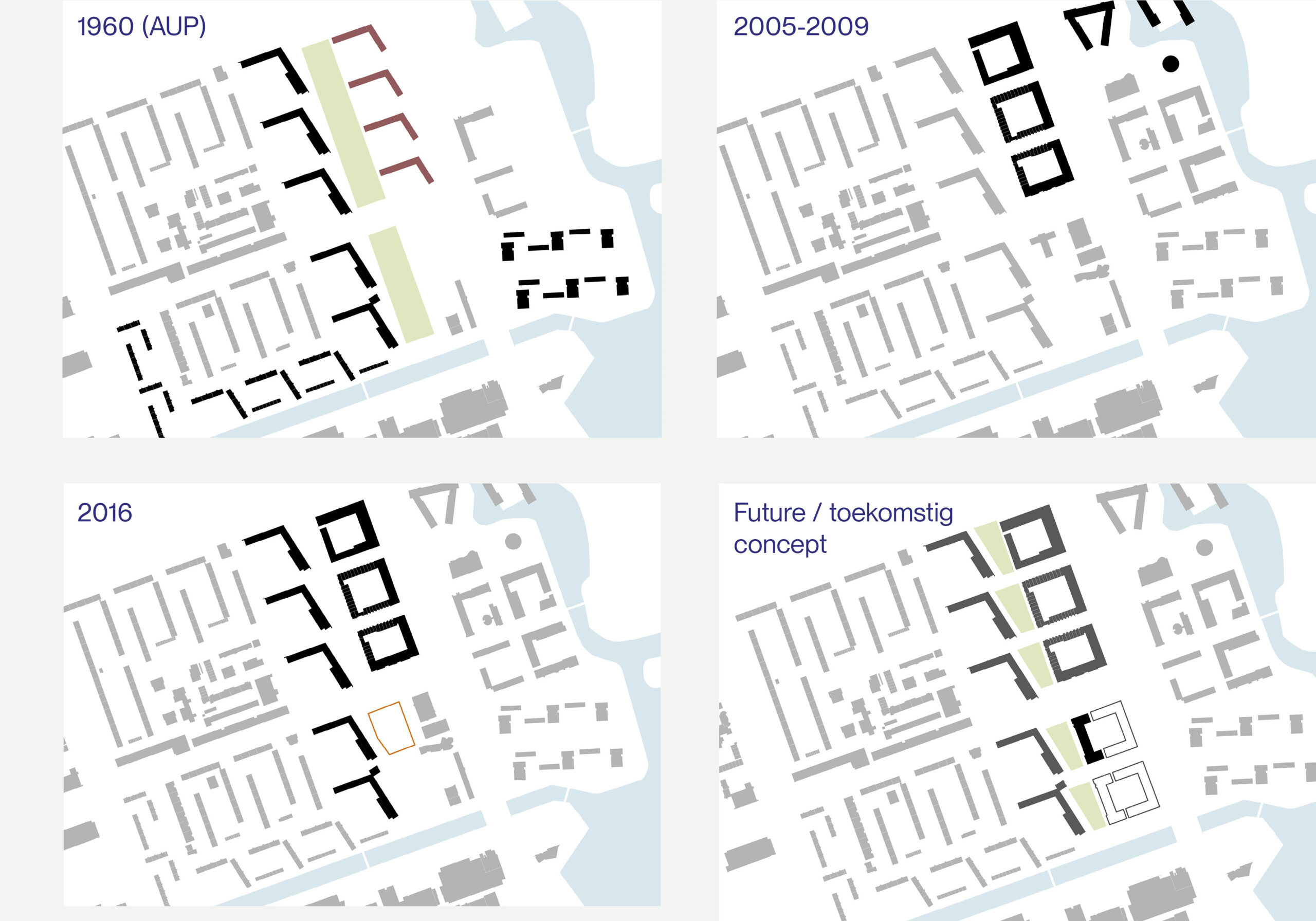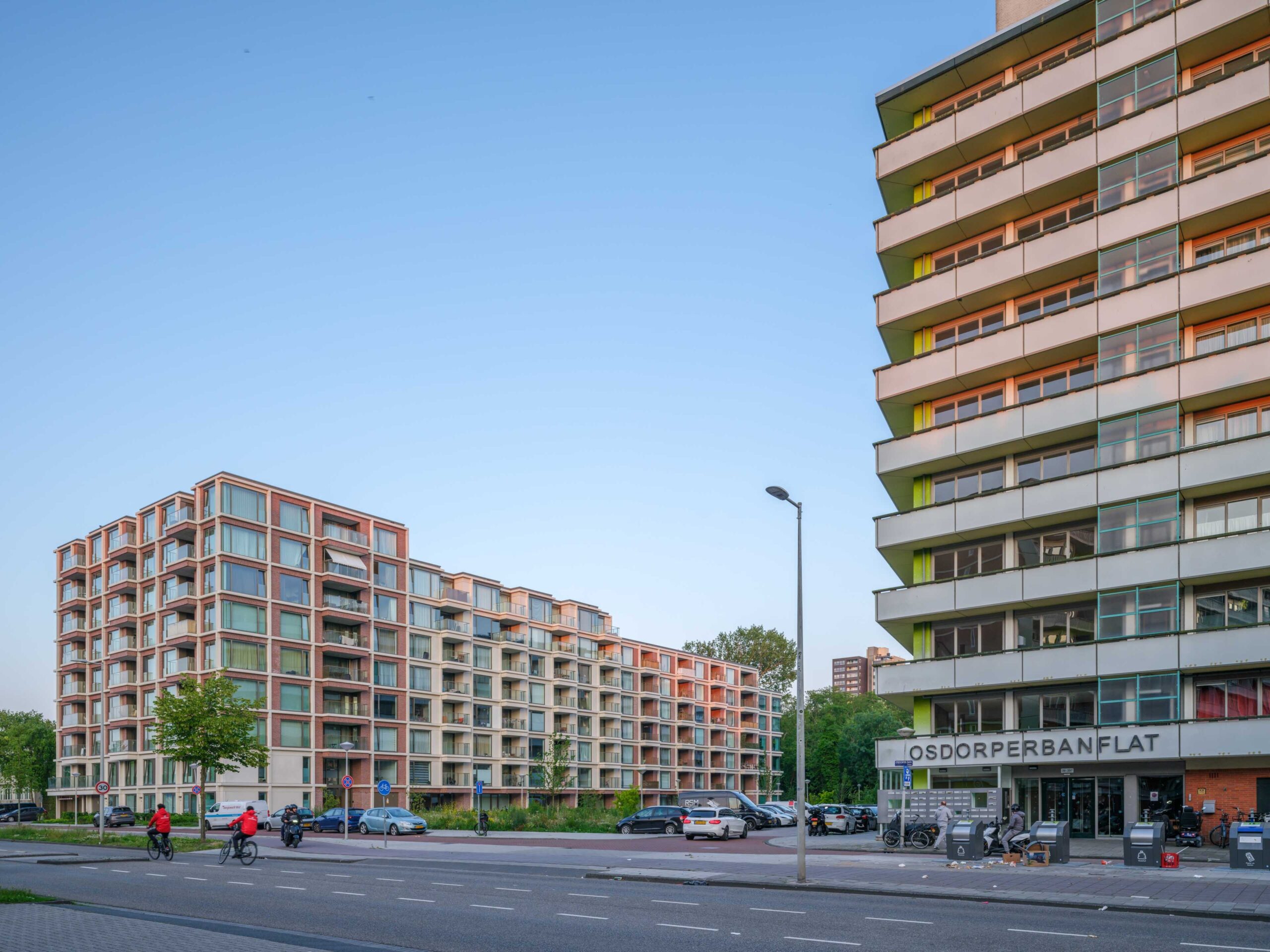 The Ox is located at the intersection of two rows of urban development. To the west stand the iconic hook-shaped blocks by F.J. van Gool from the 1960s, officially valued heritage of the Amsterdam General Expansion Plan (AUP). Parallel to that, three large-scale city blocks arose in 2005 and 2009, with a more contemporary scale and aesthetic. Together, these two rows form a distinctive urban landscape with one remaining 'incomplete' plot south of the '00s-blocks. The Ox adds new density to this plot and takes the first step towards a future vision of mirroring the five western blocks with five blocks to the east.
