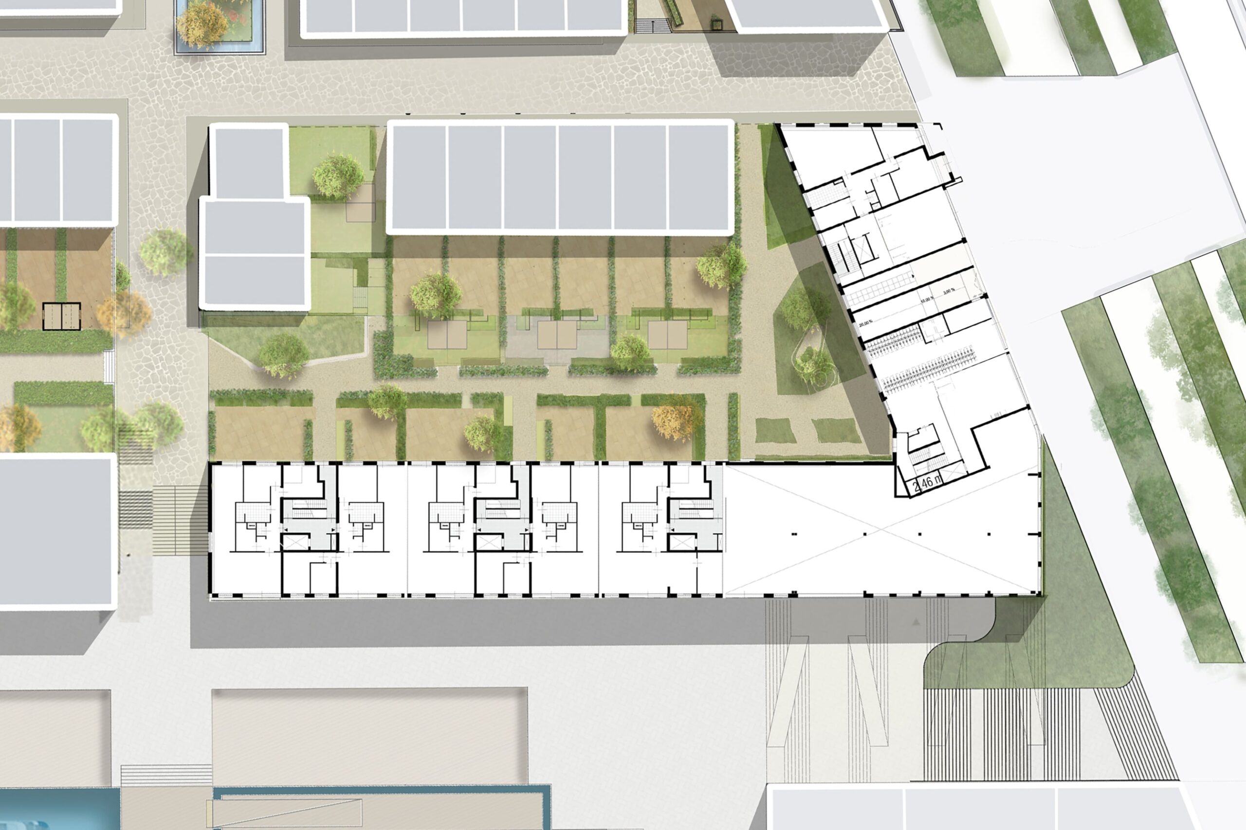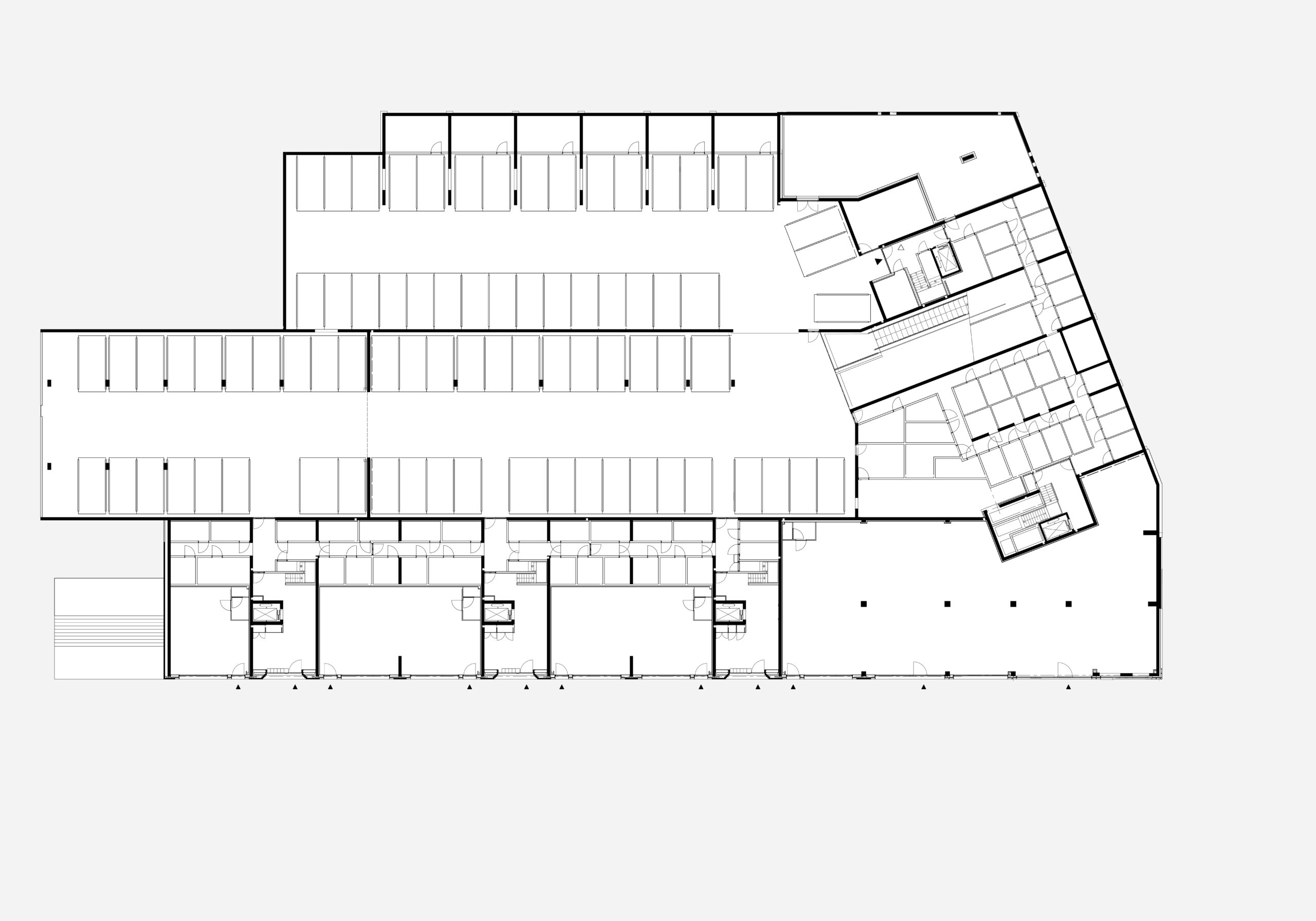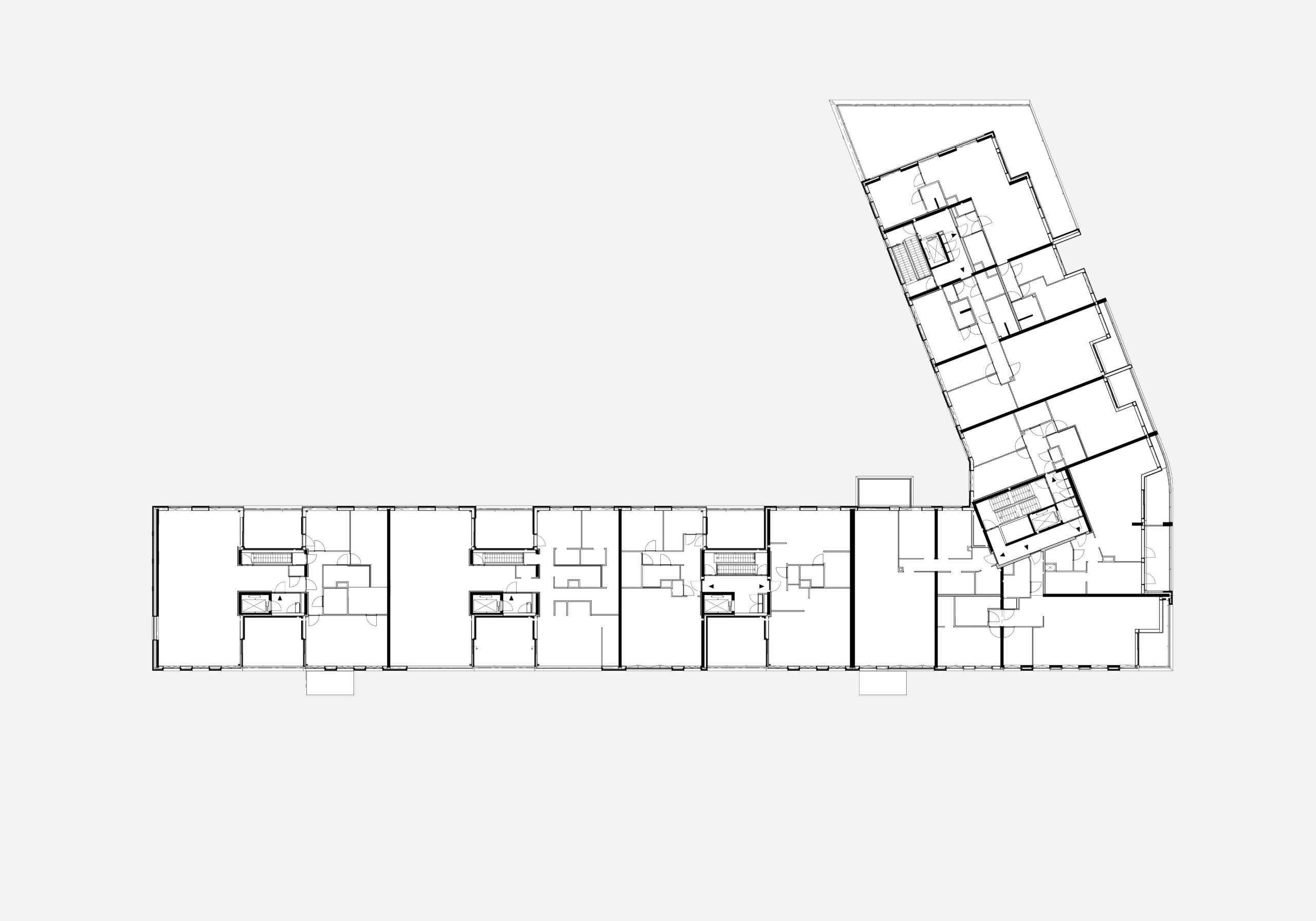 We made spacious flats, between 90 and 220m². At the quayside, porches give access to two flats per floor, except at the very top, where the entire floor forms one penthouse. The plinth provides space for port-related activities, such as a sailmaker's shop, and for spacious entrance halls. Parking is entirely underground, keeping both the quay and the village inner area free of cars.