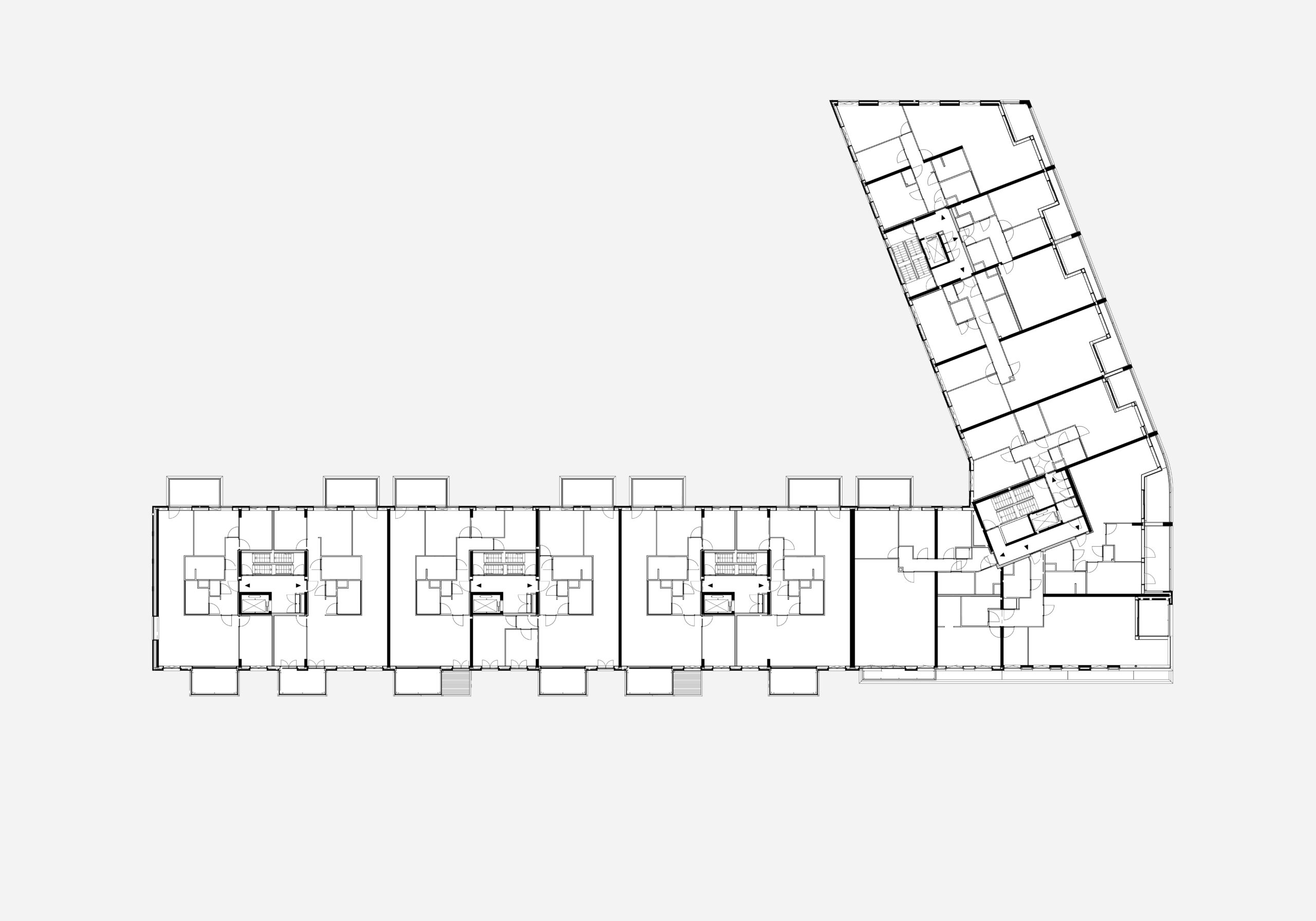 The transition between Kadeblok and Duinblok on the corner was designed carefully. Different typologies and façade architectures come together in an exciting way. The horizontal façade articulation of the adjoining blocks of the first plan section gradually changes into a grid façade in the Duinblok and then into a vertical articulation in the Kadeblok.