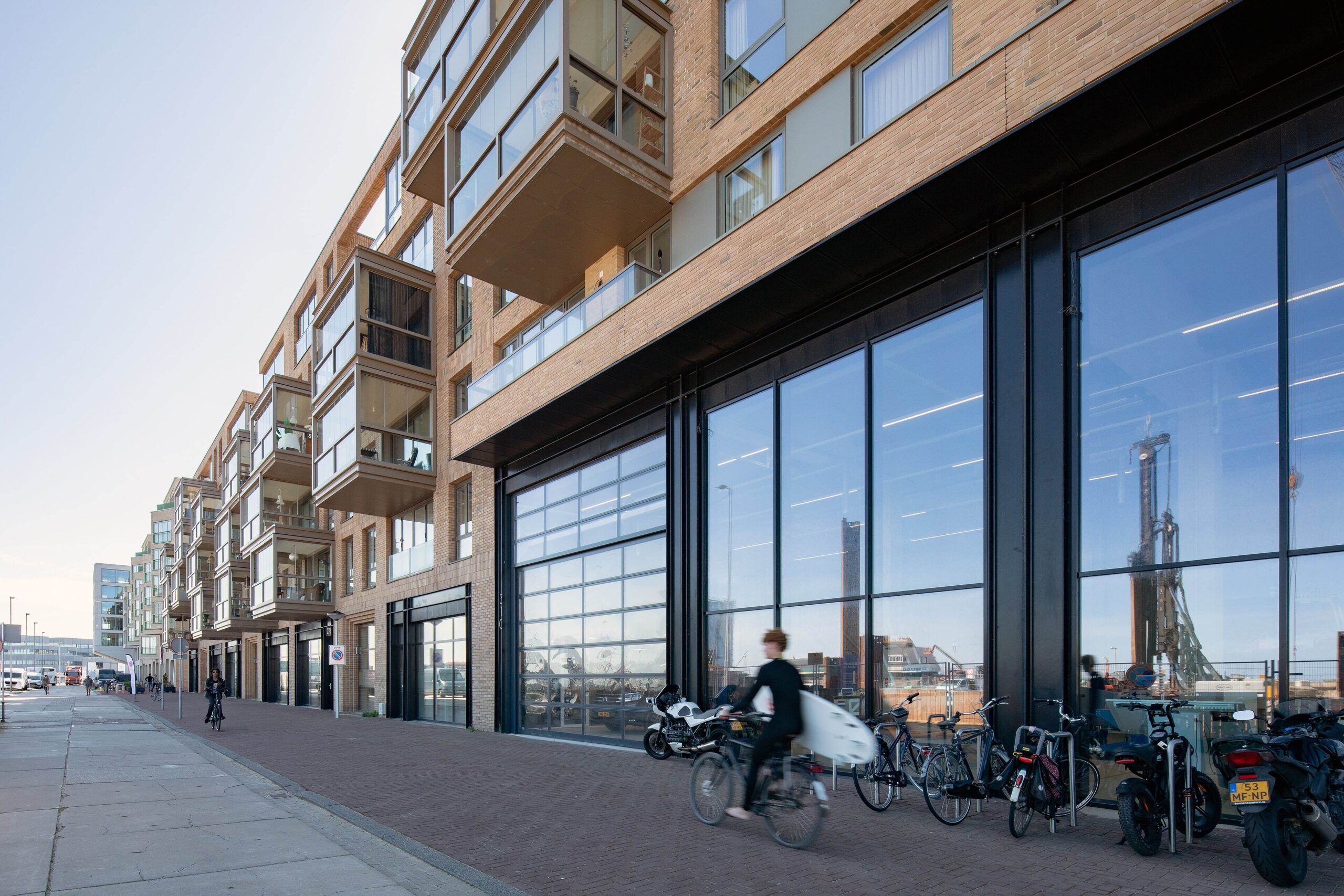 The robust grid with double-height openings in the Duinblok, the protruding bay windows in the Kadeblok and the connecting plinth with steel portals refer to the sturdy character of the former port with stacked containers. At the corner, clearly visible from the beach entrance, is a seven-storey height accent facing the sea. The volume steps down and makes a few setbacks to connect well with the other plan sections and the small grain of the village-like inner area.