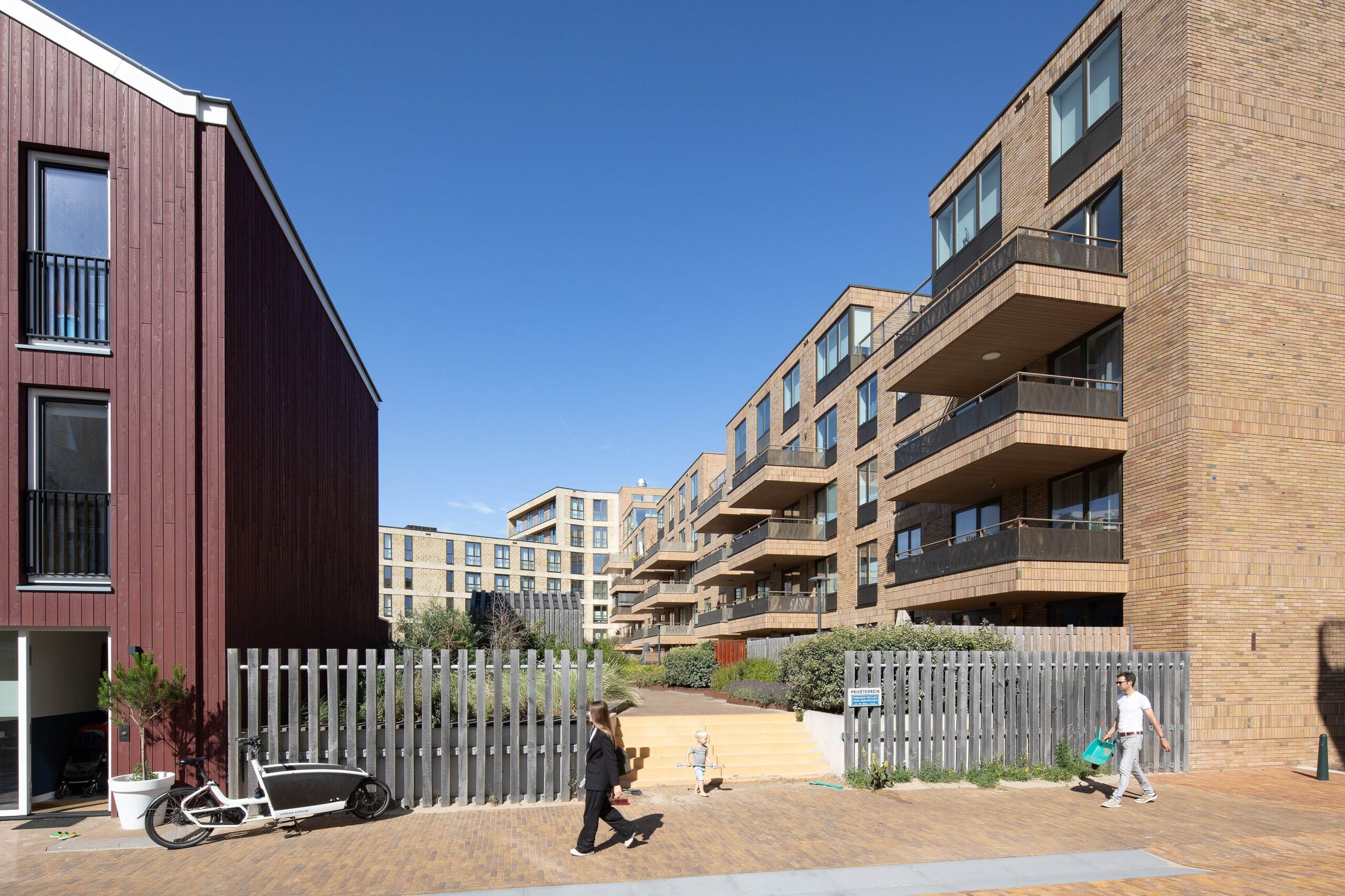 Of course, the exterior façade materials here have to withstand the harsh weather of the coast, characterised by sun, salt, sand and rain. At the same time, they tell a story about the place. The sand-coloured bricks and cladding boards match the beach, the dunes and the beach pavilions. The black steel in the plinth and aluminium of the bay windows recall the industry of the old harbour. The façade boards were realised from Resysta, a bio-based material made from a residual product of rice husk. By applying different colour and texture nuances in the brickwork, different building parts within the ensemble are accentuated.