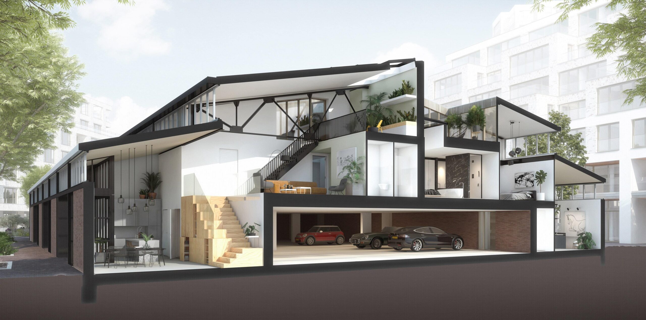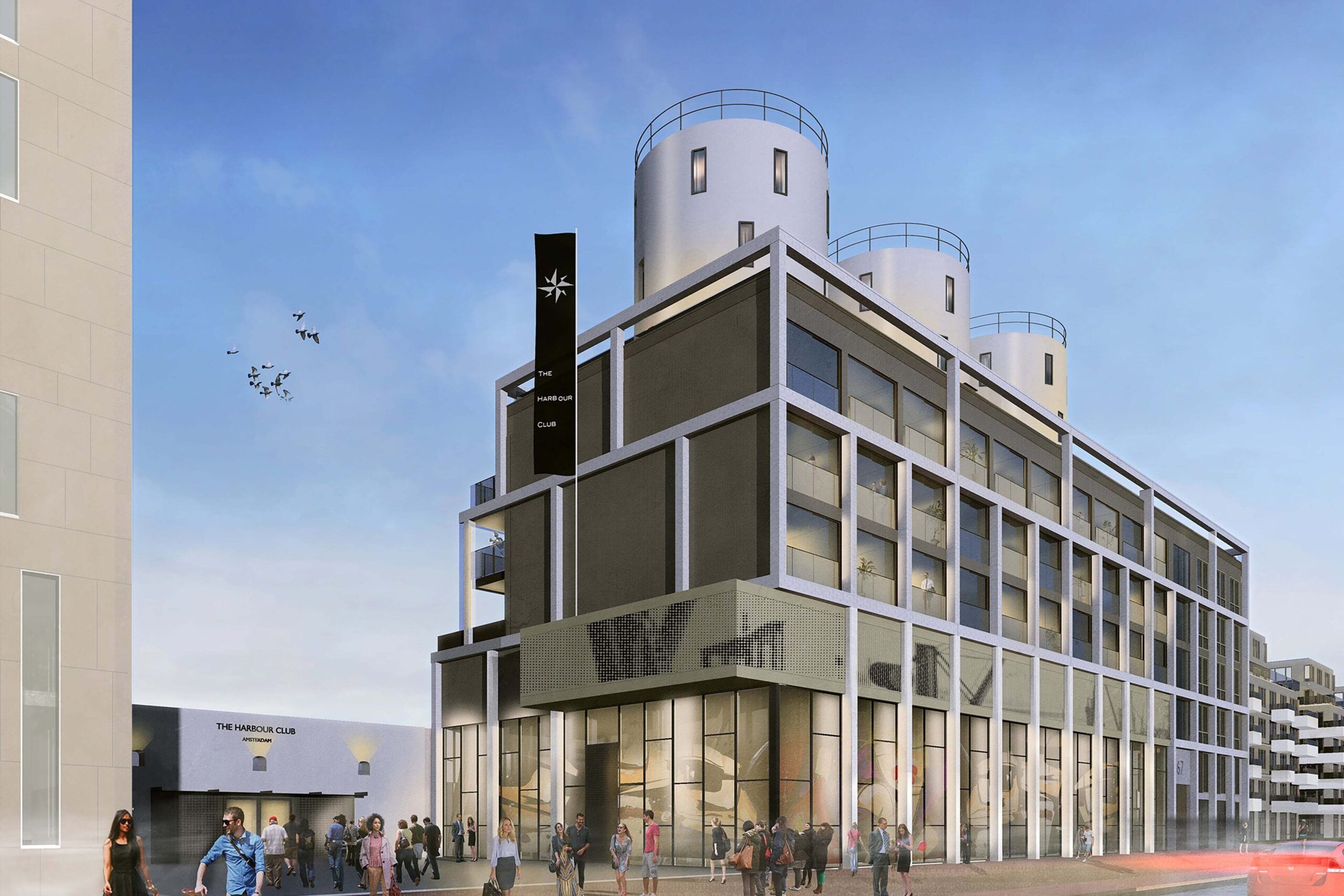 Deze restaurants zijn niet de eerste horeca op het eiland: al in 2012 betrok The Harbour Club de oude wijnterminal van Roders aan het begin van het eiland. De club werd door Amvest gefaciliteerd als kwartiermaker en dat maakten de uitbaters ondubbelzinnig waar. De houten structuur van het gebouw werd uitgenut voor een prachtig interieur, met een enorme eetzaal aan een uitgestrekt terras met uitzicht op het water. Het resultaat: grote bolides voor de deur, een afgeladen restaurant, BN’ers, feesten en grote evenementen. Misschien is het niet onmiddellijk het publiek dat je bij een pionier zou verwachten, maar het succes was groot en het leek onvermijdelijk dat The Harbour Club hier zou blijven. Amvest vroeg ons om het permanente karakter vorm te geven, inclusief een echt geluiddichte doos voor evenementen en woningen bovenop het bestaande gebouw. Het zal een kloek blok worden dat met z’n stoere rauwe uitstraling recht doet aan de positie als ‘gastheergebouw’ van Cruquiuseiland. Kers op de taart zijn de drie bestaande wijnsilo’s die op het volume worden geplaatst en waarin woningen komen: circulariteit avant la lettre. De tijdelijke verplaatsing van de silo’s naar de kop van het eiland was overigens absoluut een spektakel!