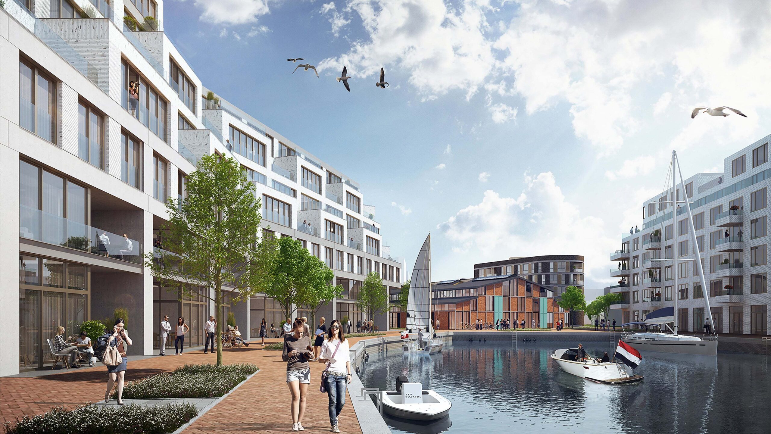 Amvest wilde voor het appartementengebouw een mediterrane, maritieme en tegelijk ietwat industriële sfeer. De maatvoering van de plot van het appartementengebouw, de regels en het feit dat we de grond niet in konden vanwege vervuiling, hebben geleid tot een gebouw dat niet eenvoudig in een bepaalde typologie past: een massief blok, een gesloten bouwblok, een toren, een apenrots, van alles zit er wat in. En met een zee aan verspringende dakterrassen werd het nog maritiem ook. Het blok herbergt een extravagante rijkdom aan woningtypes, nagenoeg geen woning is hetzelfde: van kadewoningen voor gezinnen, sociale huurappartementen voor starters, woningen aan een mysterieuze binnenhof tot extravagante penthouses. Alle woningen hebben een grote en bijzondere buitenruimte die een relatie met het water aangaat. De steenkeuze is experimenteel en leidde op het allerlaatst nog tot een ware crisis. Uiteindelijk kwamen de stenen uit het oosten van Duitsland, werden net over onze grens tot strips verzaagd en vervolgden dan hun weg naar Groningen, waar de hele gevel in prefab werd voorbereid en tenslotte op de Cruquius tot een gebouw werd geassembleerd. Een moderne bouwmethode is het zeker, maar of die voldoende duurzaam is, dat blijft de vraag.