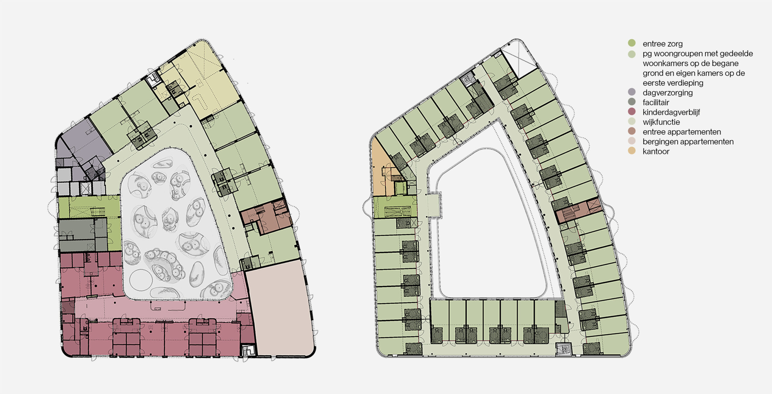 Met de kennis van nu blijkt Archipel alweer gedateerd, met zijn vaste kleinschalige woongroepen en vele zorgondersteunende functies, het grote restaurant en het gezondheidscentrum met verpleeghuiszorg. Bij onze volgende zorgprojecten moesten wij opnieuw kijken en luisteren om weer andere inzichten eigen te maken. Was bij Archipel de vaste woongroep met acht bewoners nog de bouwsteen van het wonen voor dementerenden, werd De Bouwmeester in Utrecht meer een psychogeriatrisch (PG) wooncomplex, gebaseerd op het concept ‘gelaagd wonen’, met zes woonkamers op de begane grond langs een besloten rondloop en op de verdieping voor elke bewoner een eigen zit-slaapkamer. Vanuit de zorgaanbieder SHBU kwam het inzicht dat bewoners in vaste woongroepen zich vaak opgesloten voelden. Door de woonkamers met verschillende woonsferen open te stellen kan een bewoner per dag een van de gemeenschappelijke woonkamers kiezen om te verblijven; ’s nachts verblijft iedereen op de eigen kamer. Dit komt voort uit een bepaalde visie, maar is zeker ook een efficiëntieslag, noodzakelijk om met het schaarse personeel zorg te kunnen bieden. De begane grond en de binnentuin van De Bouwmeester worden door de PG-bewoners gedeeld met baby’s en peuters van nul tot vier van het kinderdagverblijf, vanuit de gedachte dat de ontmoeting tussen verschillende generaties, waarvan de belevingswerelden misschien wel dicht bij elkaar liggen, de ouderen zou activeren. Kinderen en hun ouders zijn zich dagelijks bewust van het bestaan van de PG-bewoners. Het plan levert prachtige doorzichten en beelden op, maar wij hebben nooit scherp gekregen of de idealen, die er vaak aan de basis liggen van dergelijke keuzes, ook ingevuld worden.