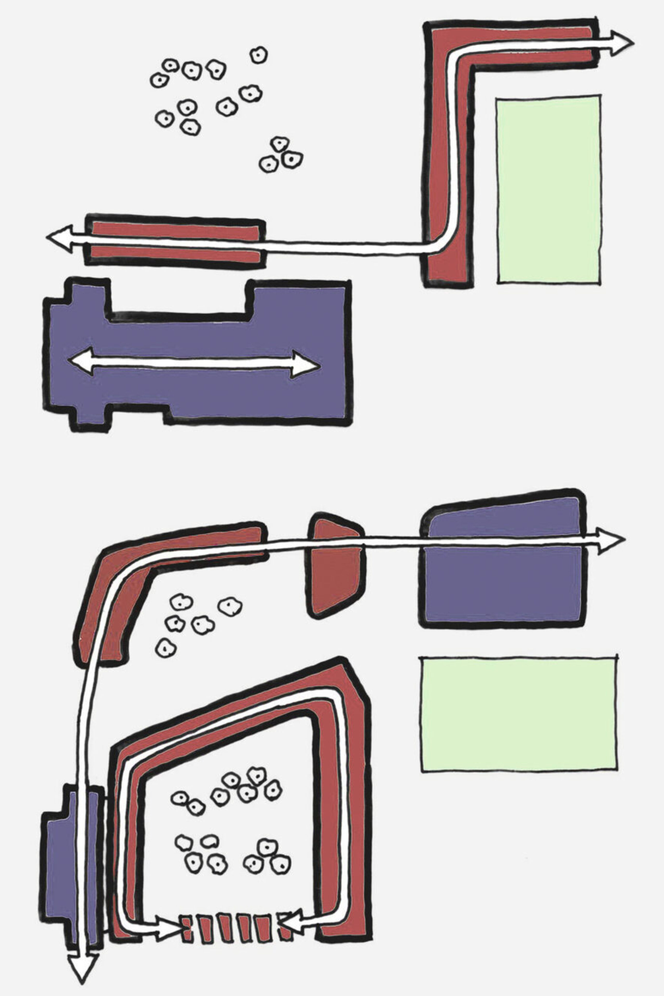 Het stedenbouwkundige uitgangspunt van de gemeente, twee schijven met onderin de fitnessfaciliteit, ‘verstopt’ achter het groen, was vooral ingegeven vanuit een defensieve gedachte: hoe kunnen we het project realiseren zonder dat we bezwaren krijgen? Op steenworp afstand lag immers Duindorp, met zijn eigen cultuur en assertieve bewoners. In de visie van de gemeente bleven wat ons betreft alle mogelijke kwaliteiten van de locatie onbenut. De geïsoleerde positie was op zichzelf aantrekkelijk, maar wij streefden naar verankering in het sociale weefsel en de stedenbouwkundige context. Met onze ambitieuze opdrachtgever gingen wij de buurt verkennen, om te horen wat er leefde, en zochten we naar verbeteringen die een win-winsituatie zouden kunnen opleveren. Wij wilden niet alleen appartementen, maar ook grondgebonden woningen, de school juist langs de straat met een mooi schoolplein. En dit alles rond een plein voor de bewoners en bezoekers. Kortom, een kleine gemeenschap. We maakten een omarming van de bestaande sportvelden, met aftrappende woningen en riante terrassen. En het gebouw kreeg een zachte uitstraling naar de omgeving, een duin van zandsteen.