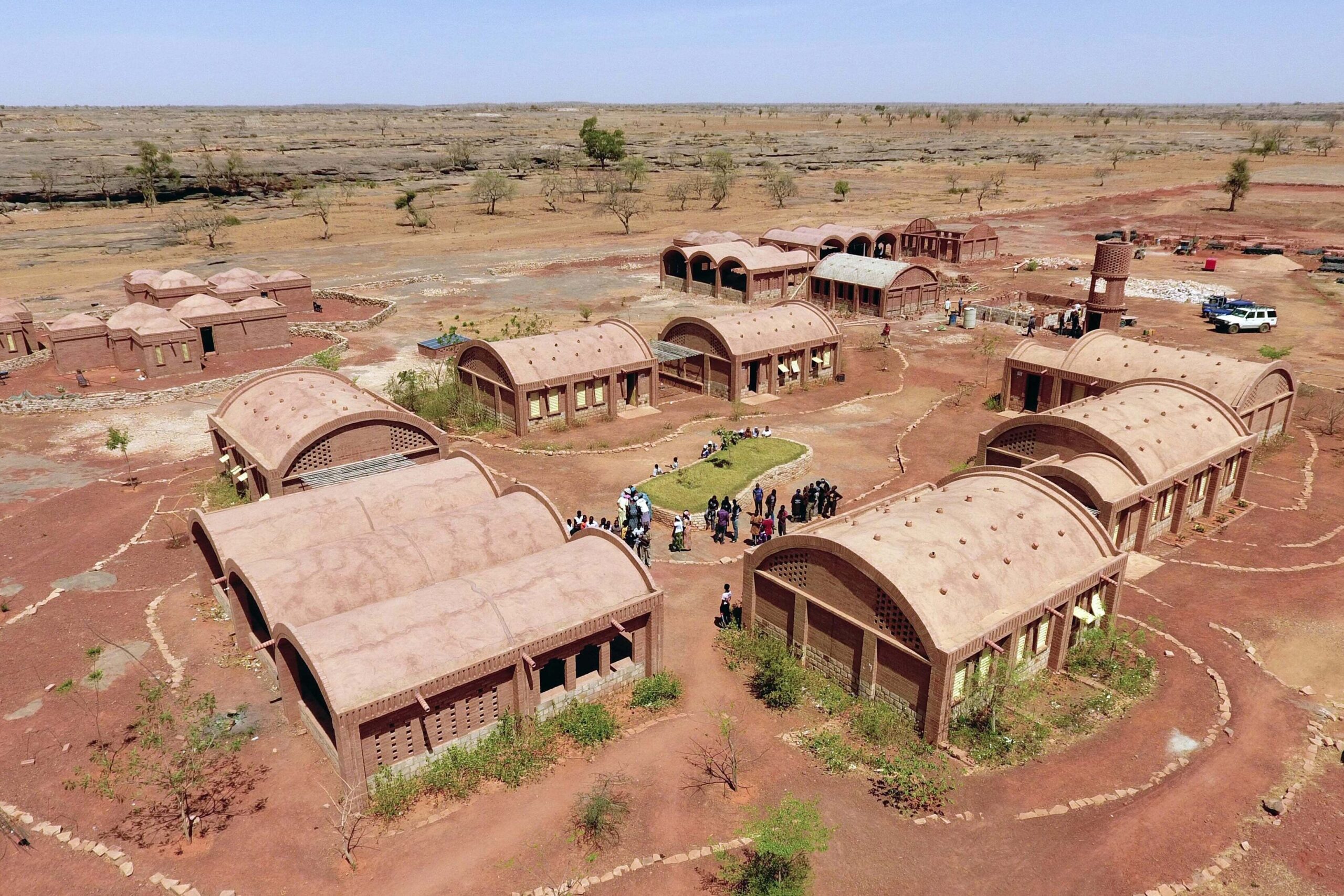 Het ‘dorp’ Sangha, met veertigduizend inwoners, bestaat eigenlijk niet: het is een samenspel van zevenendertig gemeenschappen, veelal gebouwd op de rotspartijen van het plateau. Het Praktijklyceum is gebouwd op het terrein van twee gemeenschappen, de tweelingdorpen Ogol Dah en Ogol Leh, waartussen de nog beschikbare grond tussen de rotspartijen gebruikt wordt voor landbouw. Op de rots is een amalgaam van ‘familiewoningen’, een plein en tussen de woningen af en toe een grotere ruimte voor het hele dorp; een kleine korrel van huizen, graanschuren en familiealtaren. Het Praktijklyceum in Sangha is zo ontworpen dat het geleidelijk op een organische manier kan uitgroeien tot een gemeenschap. Het bestaat uit een wooncluster voor de leraren, een cluster voor de organisatie van de school en daartussen en eromheen een groene ‘tuin’ met clusters van lokalen en werkplaatsen voor de verschillende opleidingsrichtingen: bouwen, elektriciteit, water en landbouw. Het is geen groot imposant bouwwerk, maar een gebouw met een voor dit type school in Mali relatief kleine korrel, een gebouw als dorpsgemeenschap dat met de tijd meegaat. Dit Praktijklyceum is een eerste zoektocht naar een andere typologie voor een school, naar bijzondere details en naar verschillende principes om dragende metselwerkconstructies te maken, geïnspireerd op de lokale kennis en kunde.
