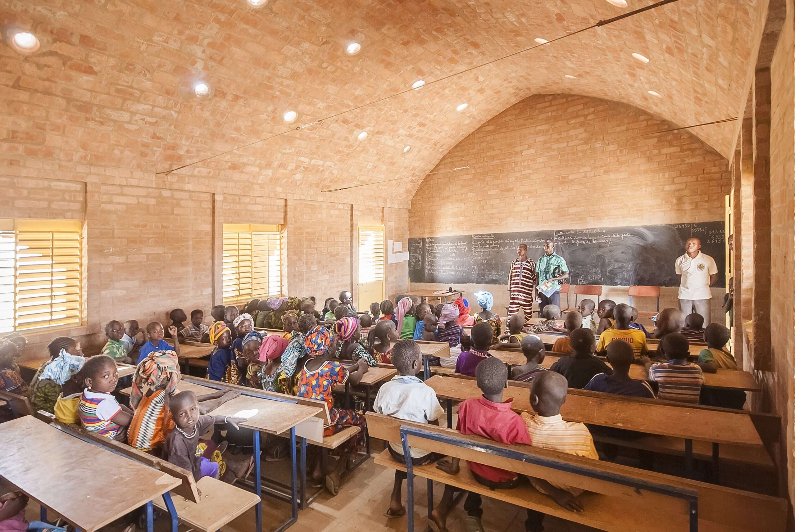 De basisscholen, zoals de school die we ontwierpen in Tanouan Ibi, staan vrijwel altijd solitair, op een door de gemeenschap bepaalde plek. Zij worden door meerdere dorpen gebruikt. Belangrijk is om in samenhang met de school ook een groene ruimte te realiseren, met bomen en water, om de nieuwe plek voor de gemeenschap te markeren. We zien steeds vaker dat, door de aanleg van tuinen en water, na verloop van tijd om de school heen uitbreidingen van de gemeenschap ontstaan.