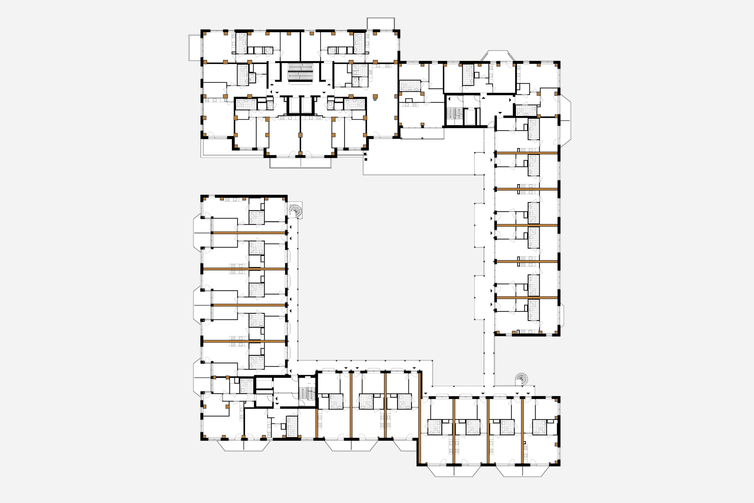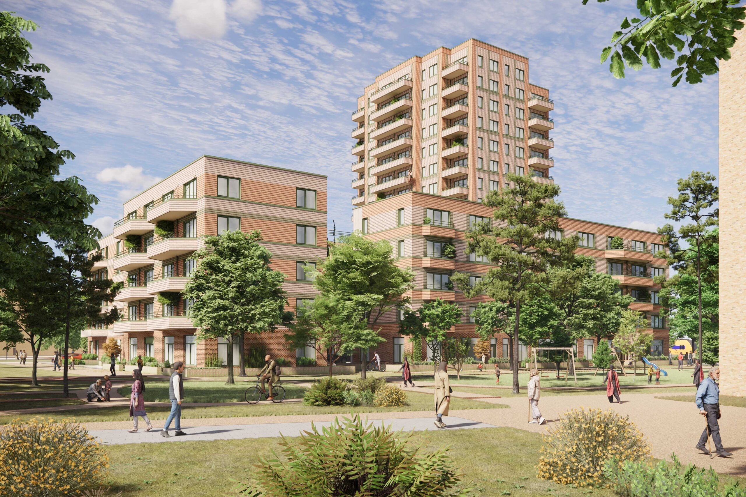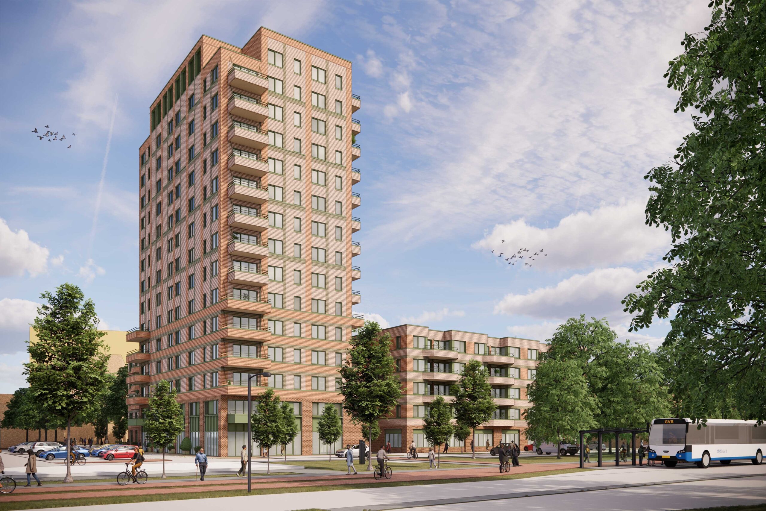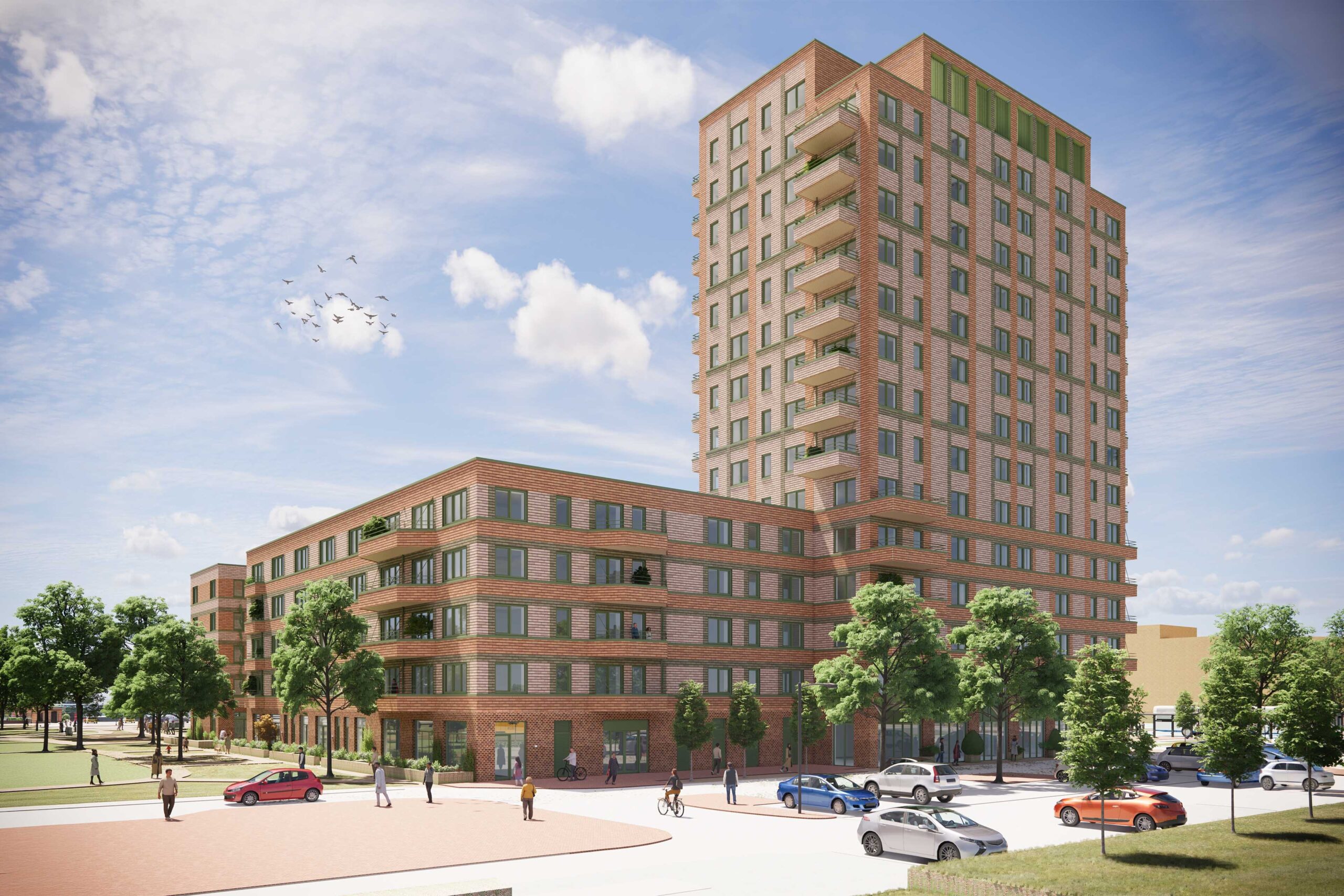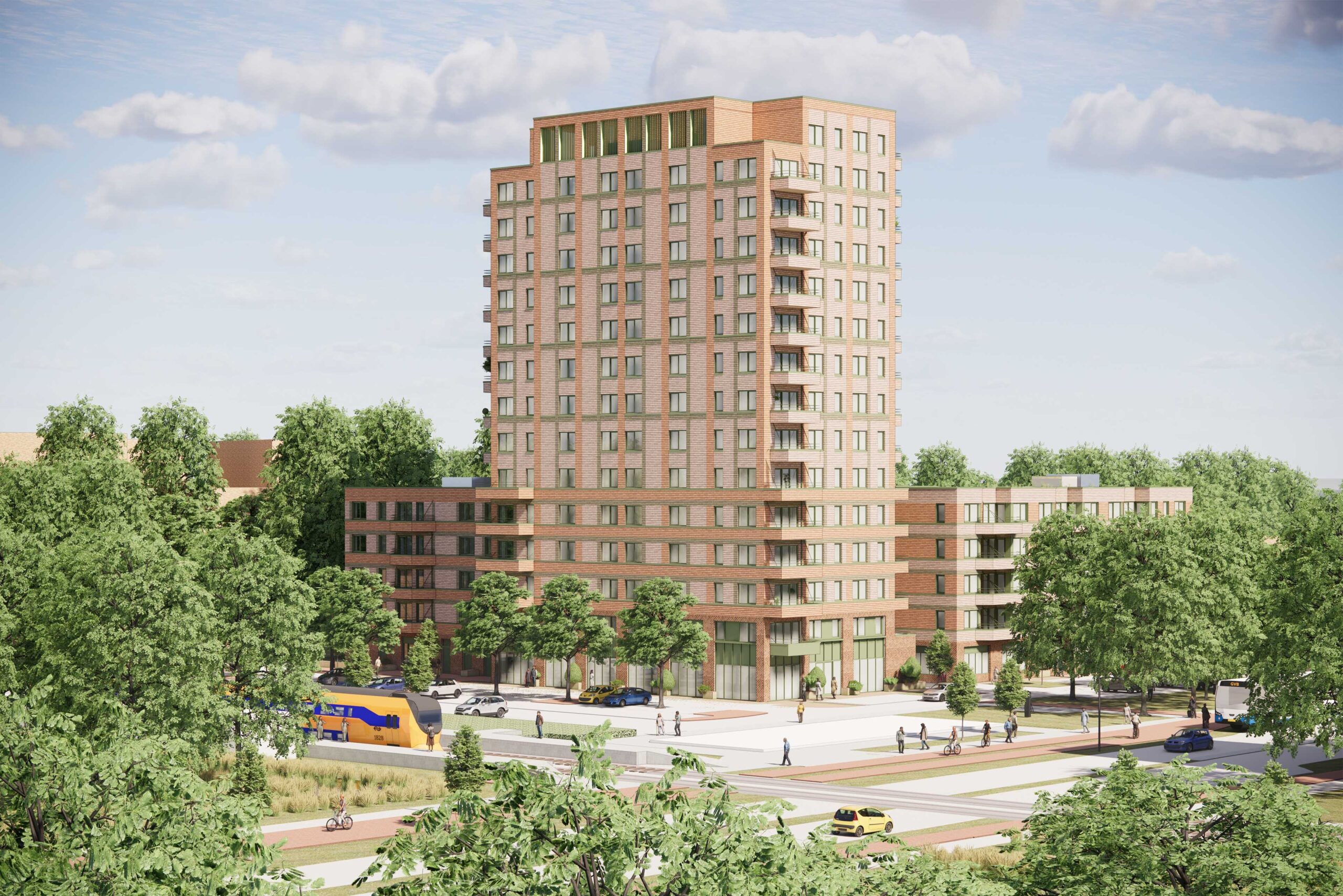 Het gebouw telt 171 appartementen verdeeld over een toren en laagbouw. In de toren komen middenhuurappartementen met drie kamers van 75-80m². De laagbouw heeft aan de parkzijde een klein aantal grondgebonden woningen en op de verdiepingen twee- en driekamerappartementen van 50-70m². De kracht zit in de combinatie: de toren markeert de plek vanaf het station, terwijl de laagbouw rondom het binnenhof een intieme schaal creëert. Drie grote bomen in volle grond zorgen voor schaduw. Nestkasten in de keramische gevel, groene gevels en groene daken maken het gebouw natuurinclusief.