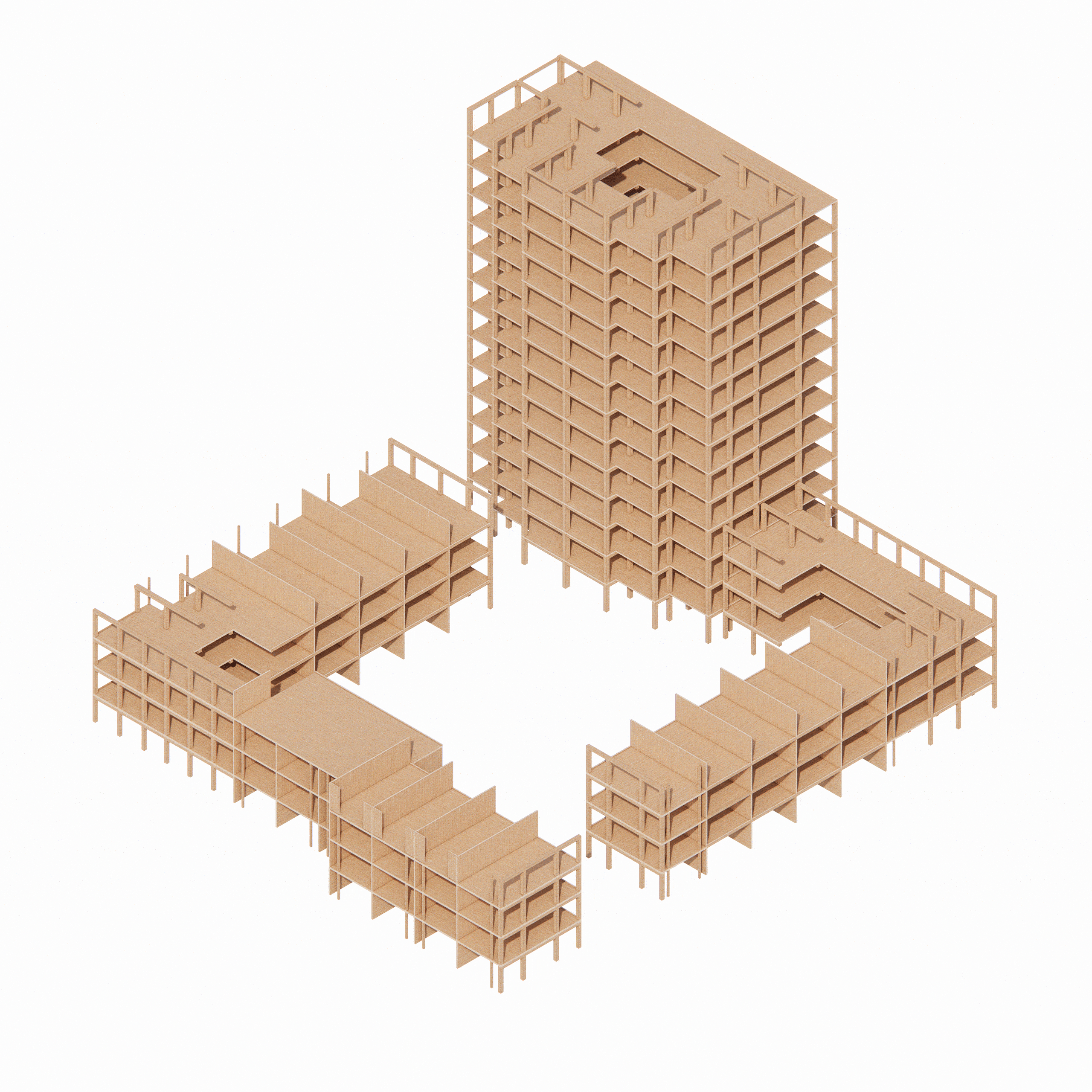 Om het maatschappelijke programma te realiseren heeft de plint extra verdiepingshoogte en daarom een betonnen constructie. Voor de stabiliteit van het gebouw zijn de drie kernen van prefab beton. Ook alle natte cellen en installatieruimtes zijn geprefabriceerd en worden als 3D-module aangeleverd. De bouw gebeurt steigerloos dankzij de lichte houtconstructie: 171 woningen in 17 maanden.