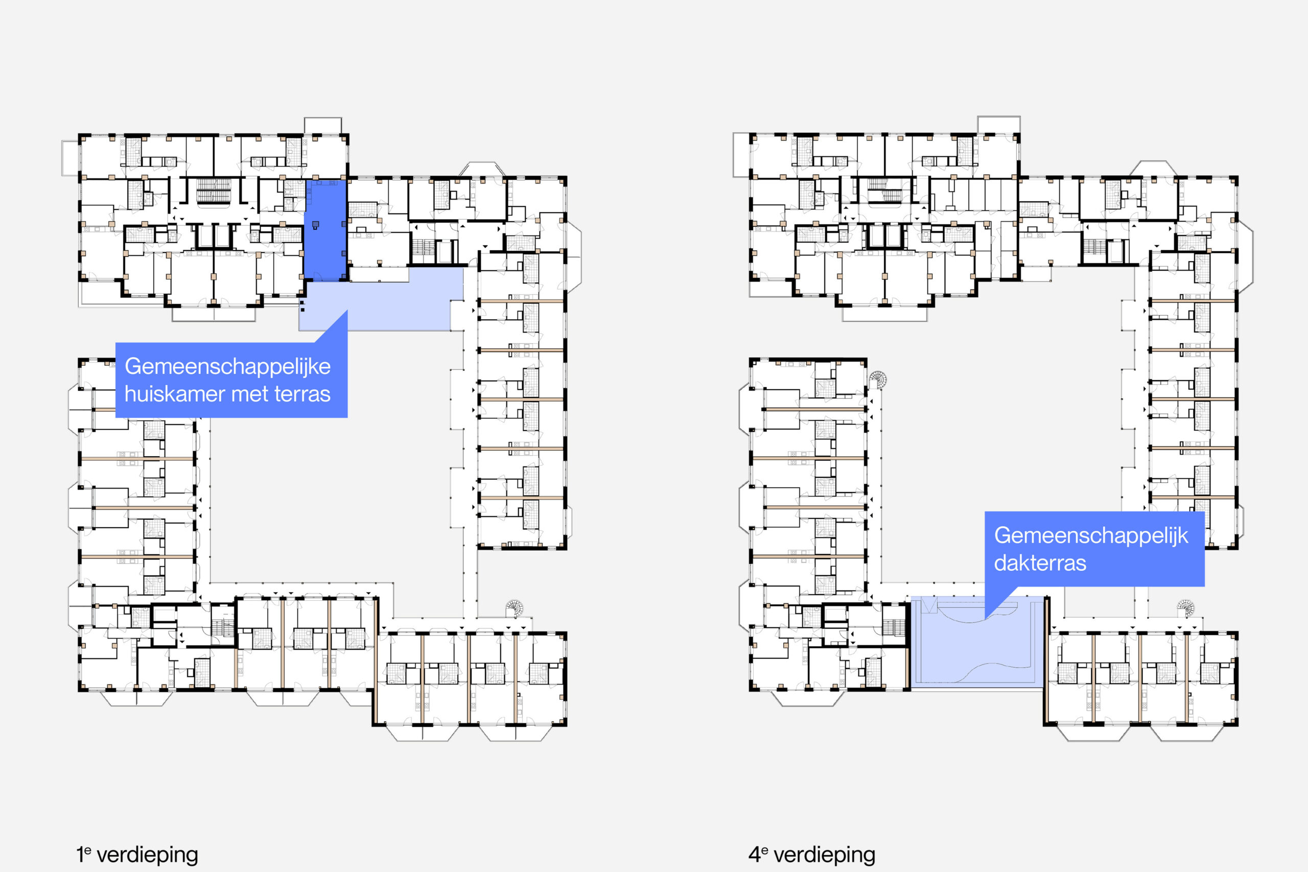 Brede leefgalerijen verbinden de woningen en nodigen uit tot gesprek. Er is ruimte voor een tuinstoel of bankje zonder de doorgang te blokkeren. Op de eerste verdieping ligt een groot gemeenschappelijk terras in de middagzon, verbonden met een collectieve huiskamer. Wie op een bank bij de lift gaat zitten, maakt vanzelf een praatje. En er is een collectief, groen dakterras. De opzet stimuleert dat bewoners elkaar zien en spreken, zonder dat het opgedrongen voelt. Overal geldt het principe 'zien en gezien worden', wat veiligheid borgt en sociale cohesie versterkt. Bewoners zorgen voor elkaar omdat ze elkaar kennen.