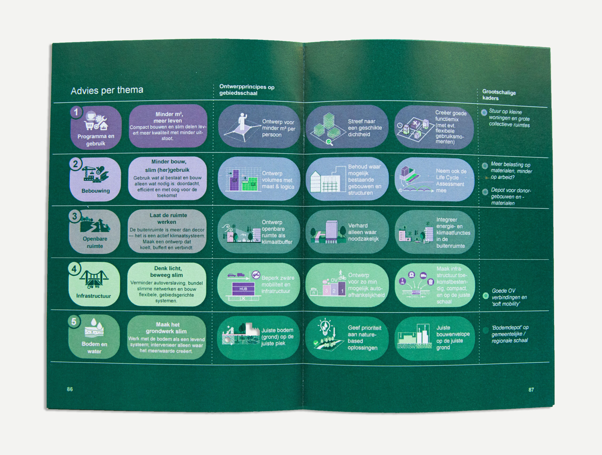 We geven handvatten om CO₂ als ontwerpparameter te gebruiken vanuit verschillende invalshoeken: programma, bebouwing, openbare ruimte, infrastructuur, bodem en water. De belangrijkste onderliggende boodschap: hanteer CO₂ niet in één enkel domein, maar zorg voor maatregelen op alle vlakken. Het is "en-en", niet "of-of".