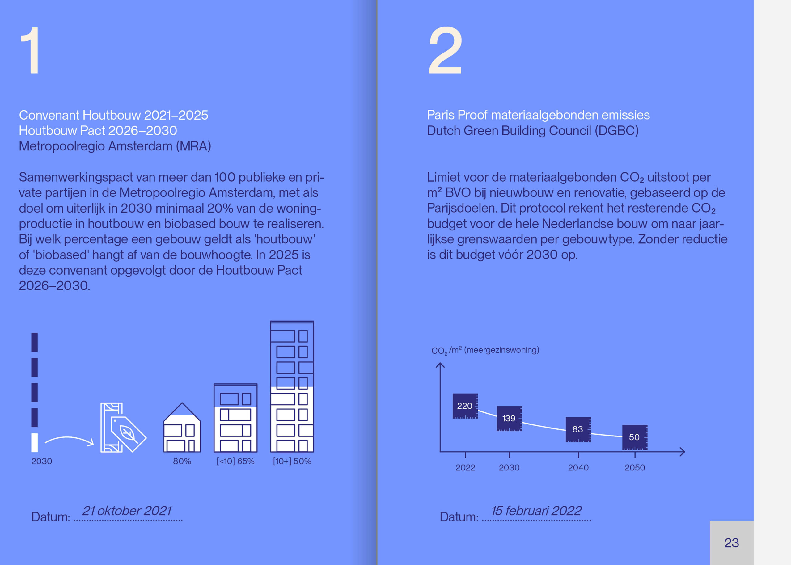 We toetsten onze projecten aan de doelstellingen die we de afgelopen jaren ondertekenden: het Convenant Houtbouw (Metropoolregio Amsterdam), Paris Proof (Dutch Green Building Council), het Convenant Toekomstbestendig Bouwen en de Commitmentverklaring Biobased Bouwen (Building Balance). Voldoen we aan onze eigen ambities? En waar liggen de uitdagingen?