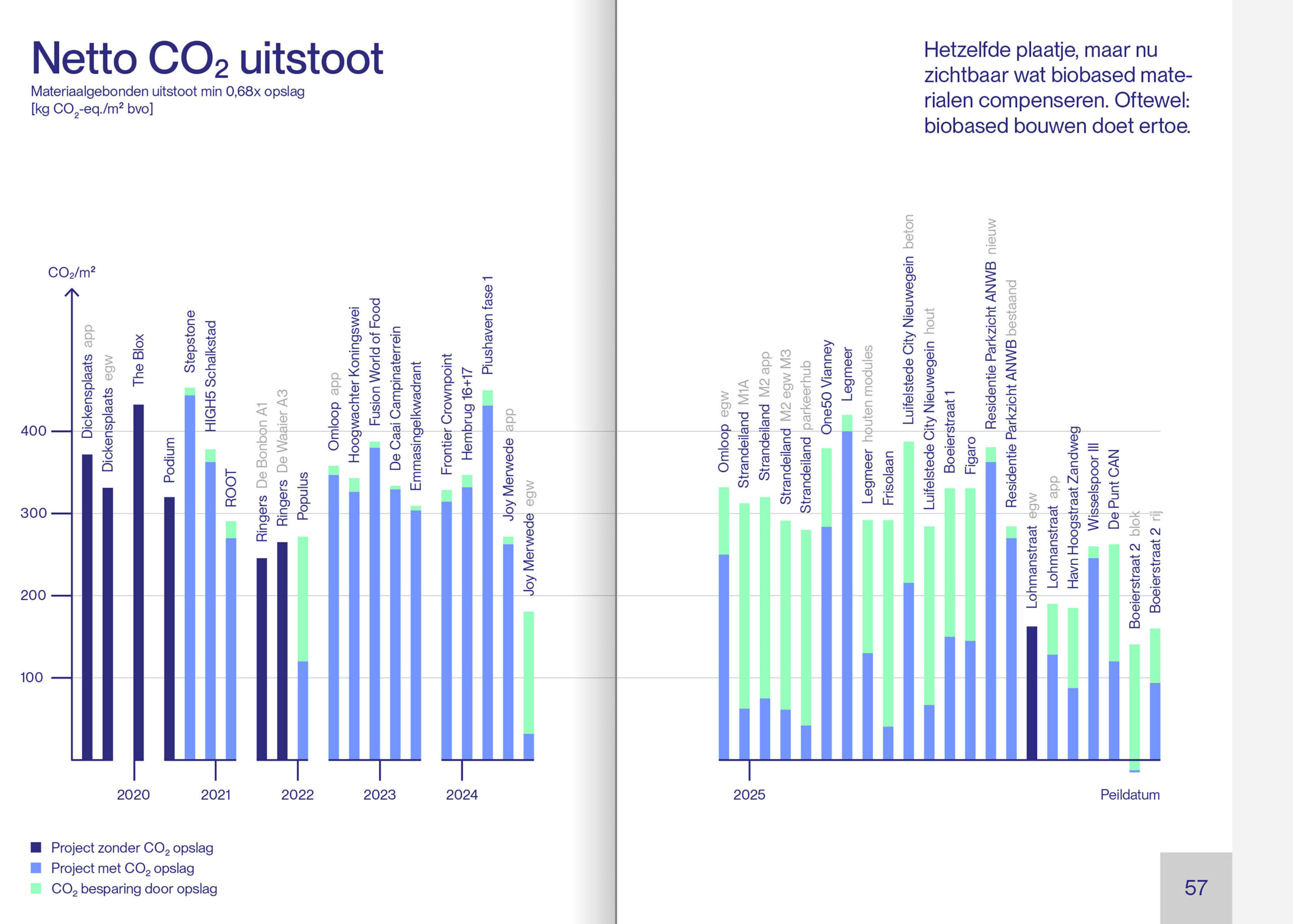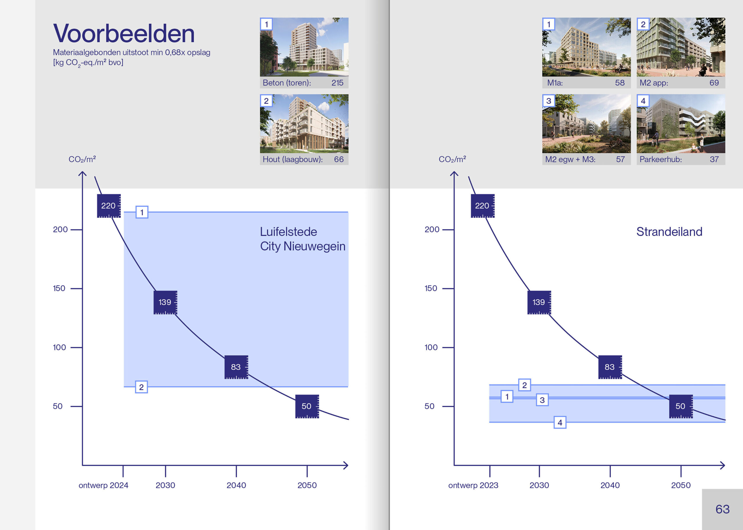 Twee derde van de onderzochte projecten voldoet aan de Paris Proof norm voor materiaalgebonden emissies. Wel worden de grenswaarden elk jaar lager: van 220 kg CO₂-eq./m² BVO in 2022 naar 50 kg in 2050. Toch zijn er ook projecten, zoals Strandeiland IJburg die zelfs nu al aan de norm van 2050 voldoen.